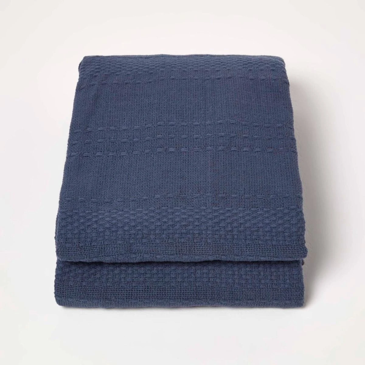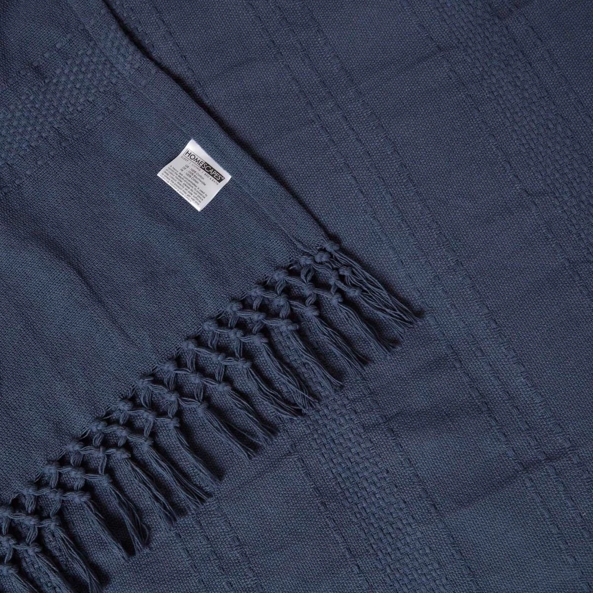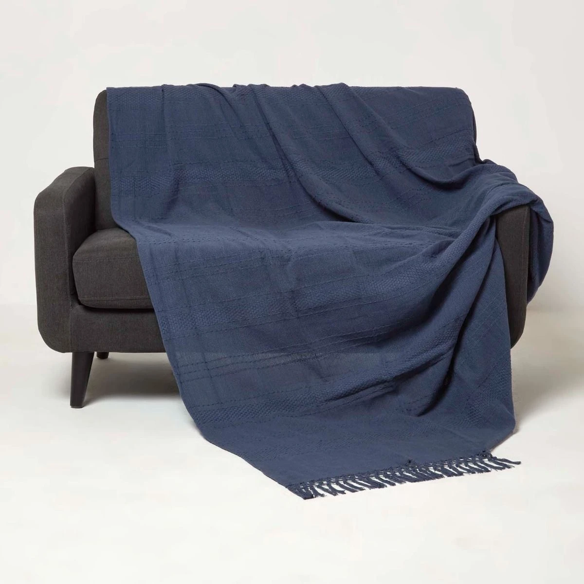 Hochwertige dunkelblaue Baumwolldecke Kashi mit dezenter, gewebter Streifen-Struktur und lässigen Fransen. Die vielseitige Decke ist in drei Größen erhältlich.