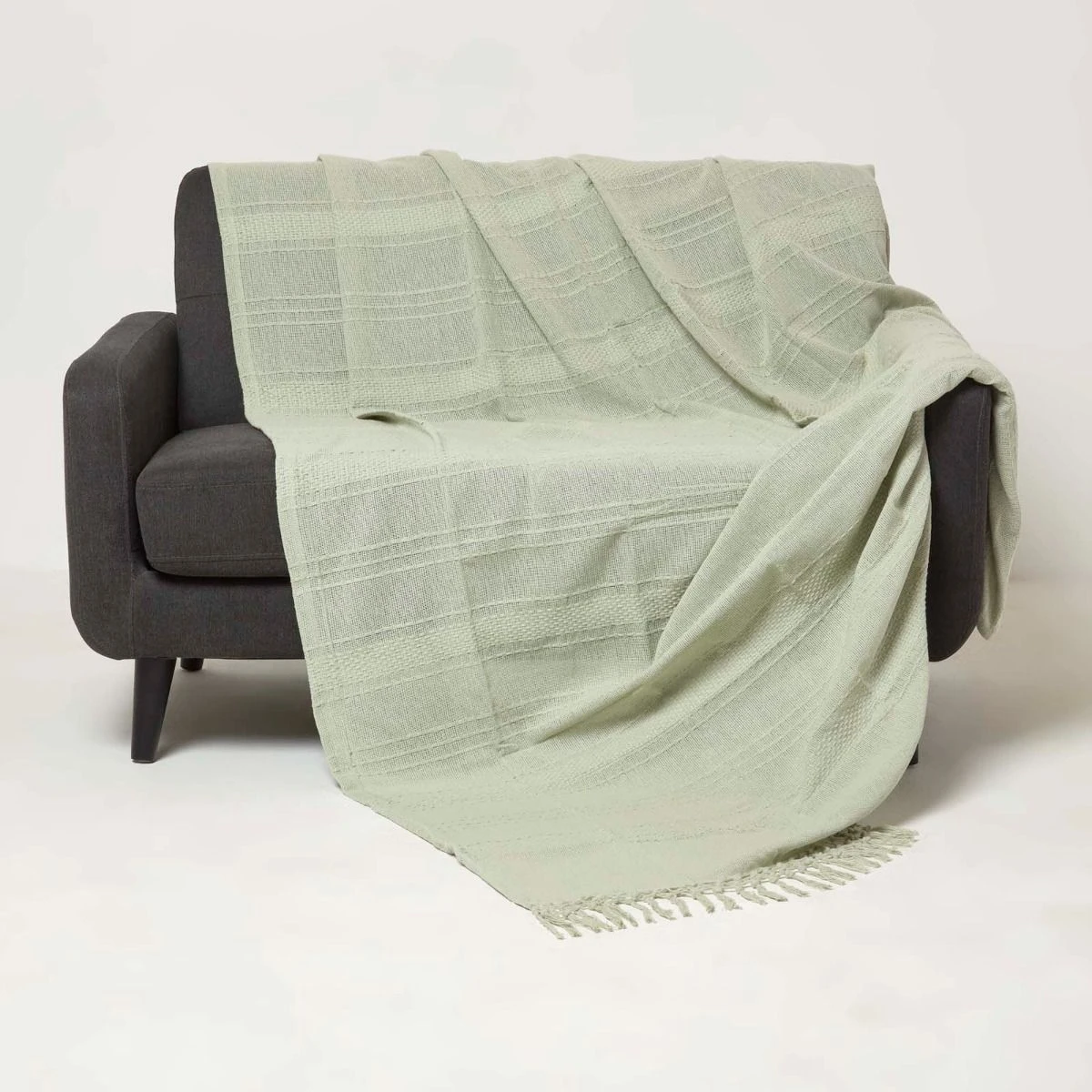 Hochwertige Baumwolldecke Kashi in Salbei mit dezenter, gewebter Streifen-Struktur und lässigen Fransen. Die vielseitige Decke ist in drei Größen erhältlich.