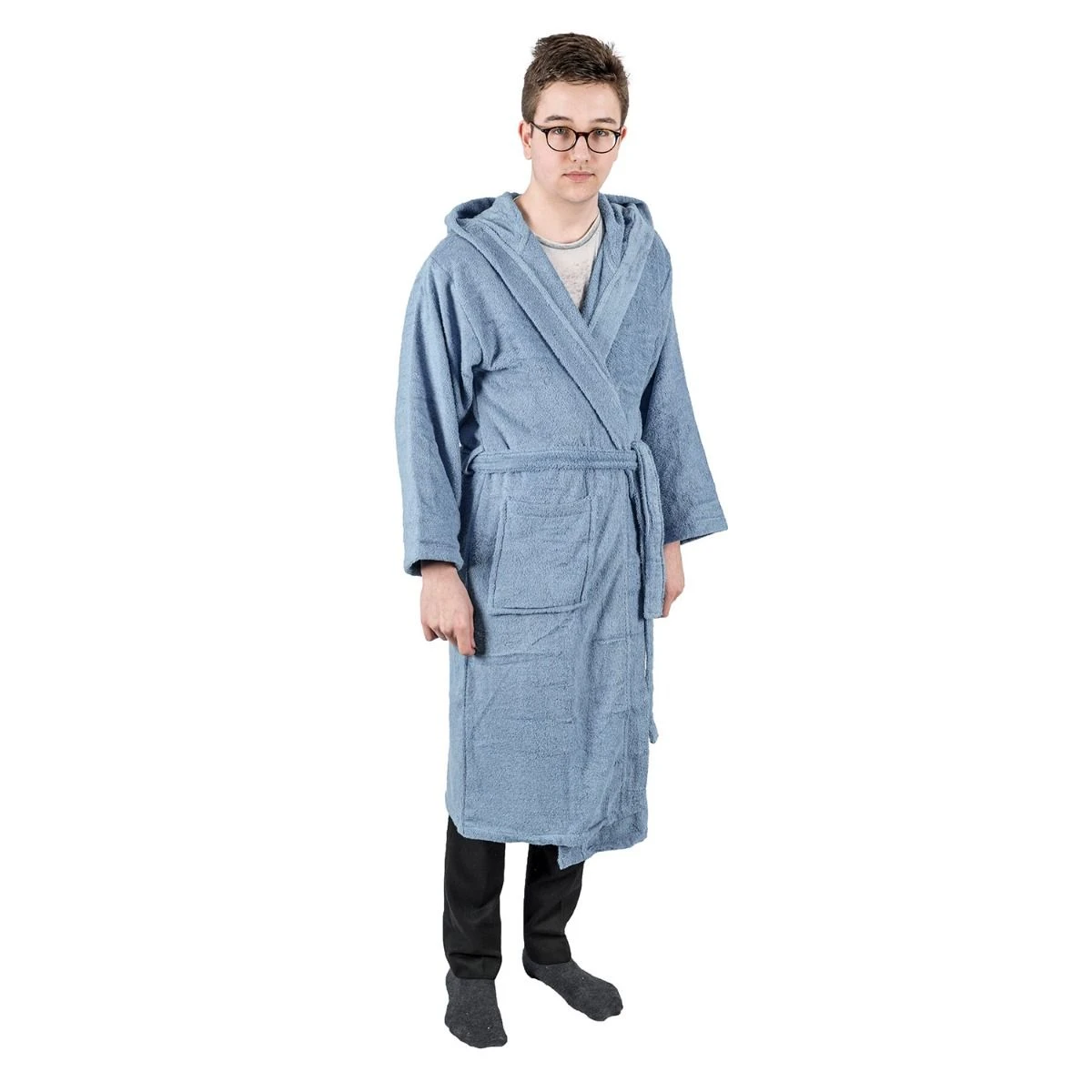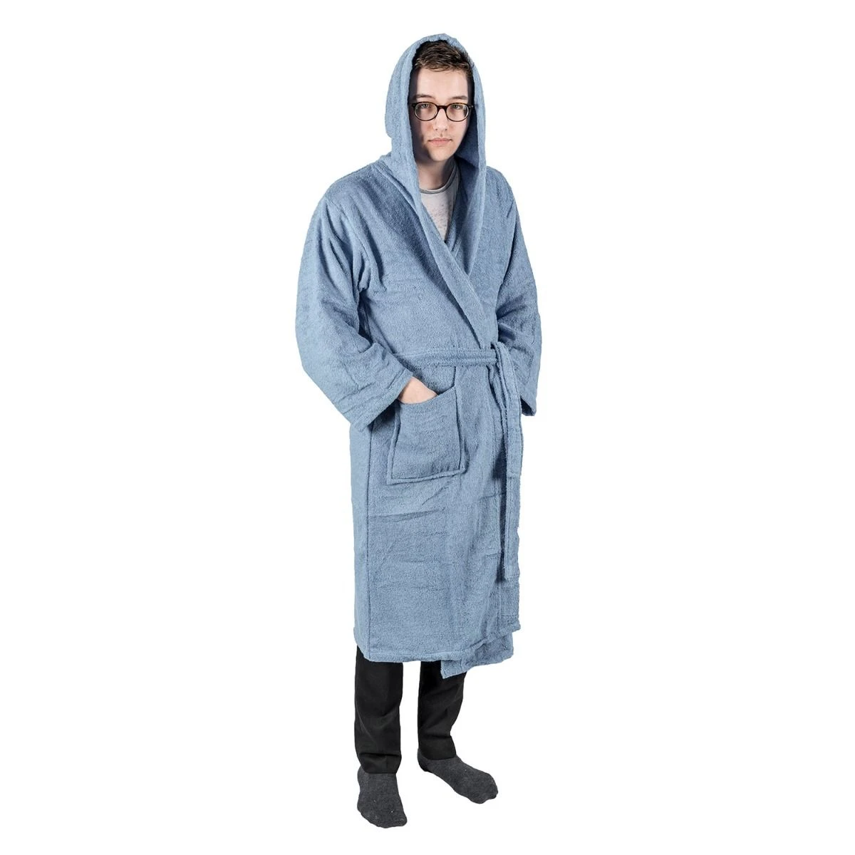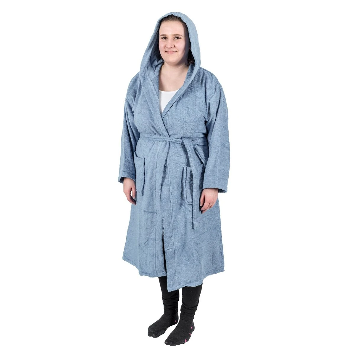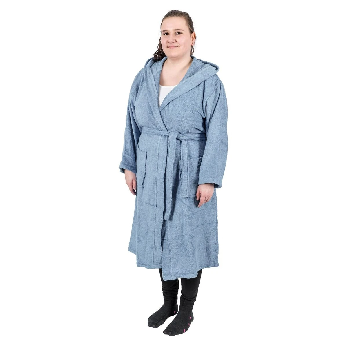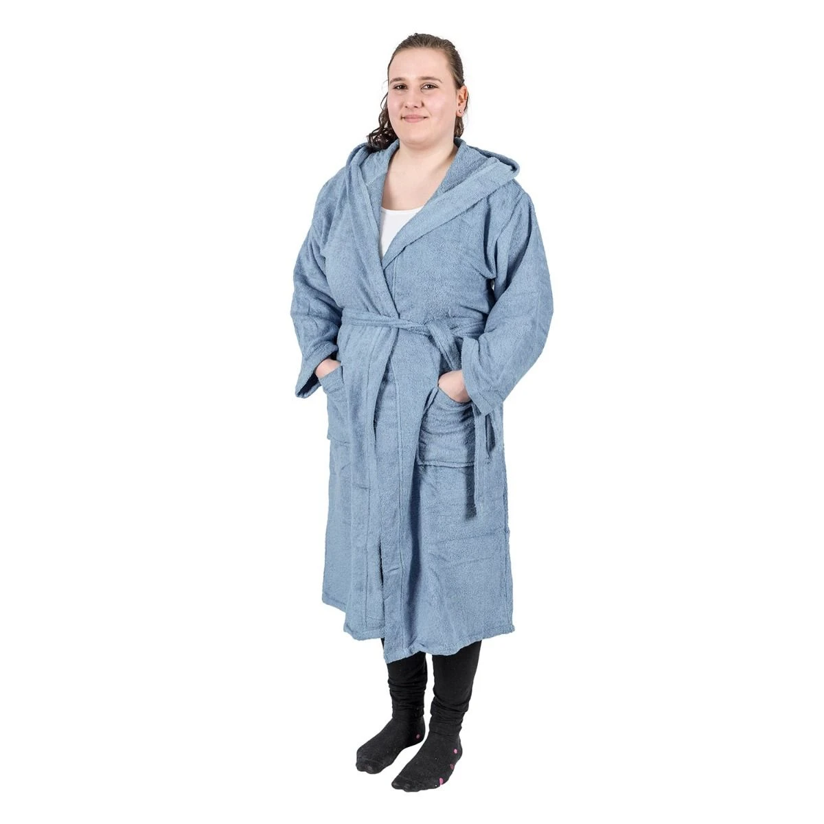 Alltäglicher, kuscheliger Bademantel für Erwachsene mit Kapuze und Taschen in Blau aus hochwertigem, hautfreundlichem Frotteestoff, Homescapes