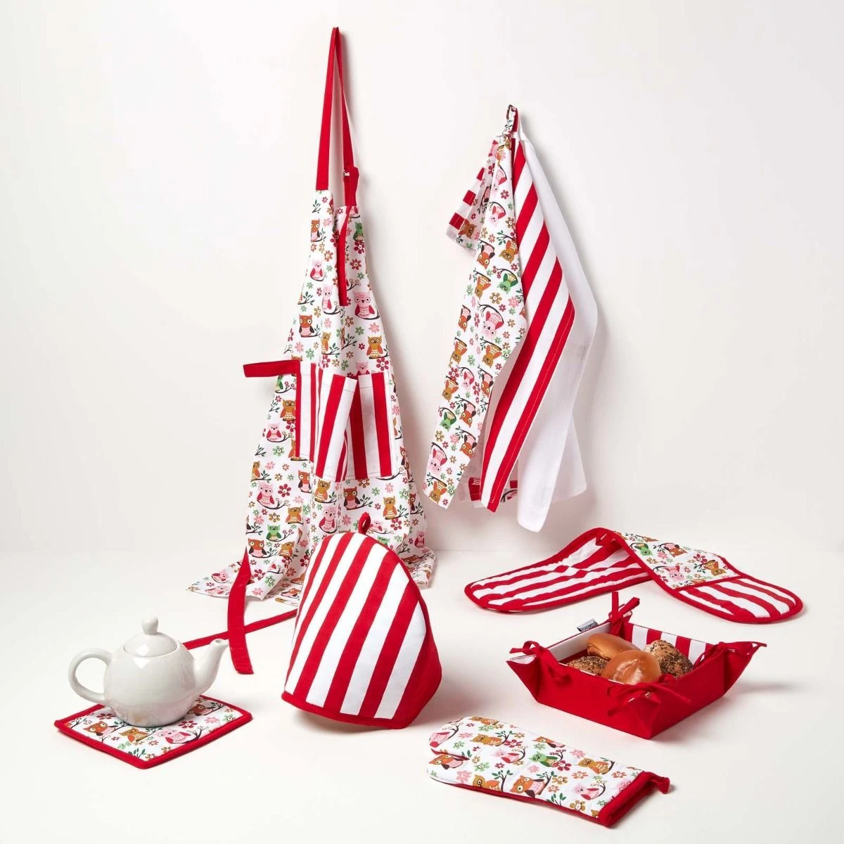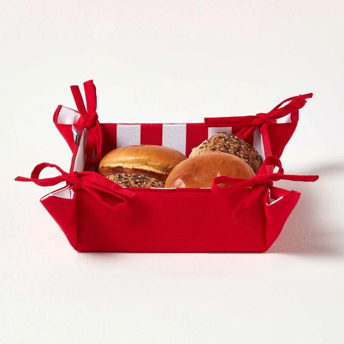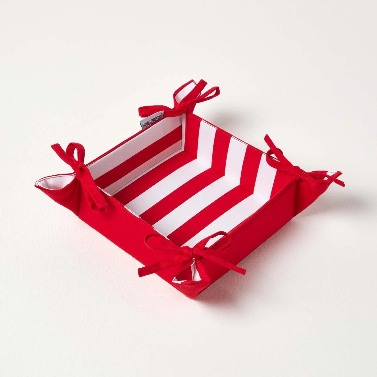 Faltbarer Frühstückskorb breite Streifen rot. Brotkörbe sind nicht nur praktisch, sondern auch perfekt um Ihren Esstisch dekorativ aufzuwerten. Homescapes kombiniert Funktionalität mit farbenfrohen Mustern und bietet Ihnen insgesamt 15 einzigartige Stoffbrotkörbe. Die quadratischen Körbe sind aus 100% Baumwolle hergestellt und am Boden und an den Seiten verstärkt. Dank der Bänder in allen 4 Ecken können Sie sich ganz einfach wenden oder auseinander falten wenn Sie sich nicht nutzen und platzsparend verstauen. Sie sehen besonders schön in Kombination mit unseren brandneuen Teekannenärmern und Rüschensitzkissen aus. Die Brotkörbchen zum Wenden können vielseitig eingesetzt werden, z.B. für Brötchen, Brot, Eier oder einfach als Dekokörbe und sind mit einem Laib Brot und Salz das perfekte Mitbringsel zur Einweihungsparty.
