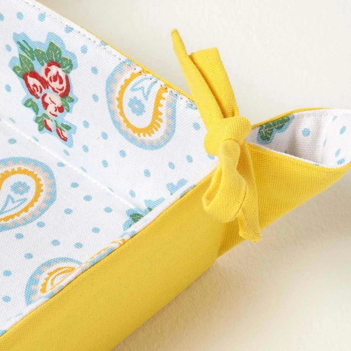 Faltbarer Frühstückskorb Paisley & Dots. Brotkörbe sind nicht nur praktisch, sondern auch perfekt um Ihren Esstisch dekorativ aufzuwerten. Homescapes kombiniert Funktionalität mit farbenfrohen Mustern und bietet Ihnen insgesamt 15 einzigartige Stoffbrotkörbe. Die quadratischen Körbe sind aus 100% Baumwolle hergestellt und am Boden und an den Seiten verstärkt. Dank der Bänder in allen 4 Ecken können Sie sich ganz einfach wenden oder auseinander falten wenn Sie sich nicht nutzen und platzsparend verstauen. Sie sehen besonders schön in Kombination mit unseren brandneuen Teekannenärmern und Rüschensitzkissen aus. Die Brotkörbchen zum Wenden können vielseitig eingesetzt werden, z.B. für Brötchen, Brot, Eier oder einfach als Dekokörbe und sind mit einem Laib Brot und Salz das perfekte Mitbringsel zur Einweihungsparty.