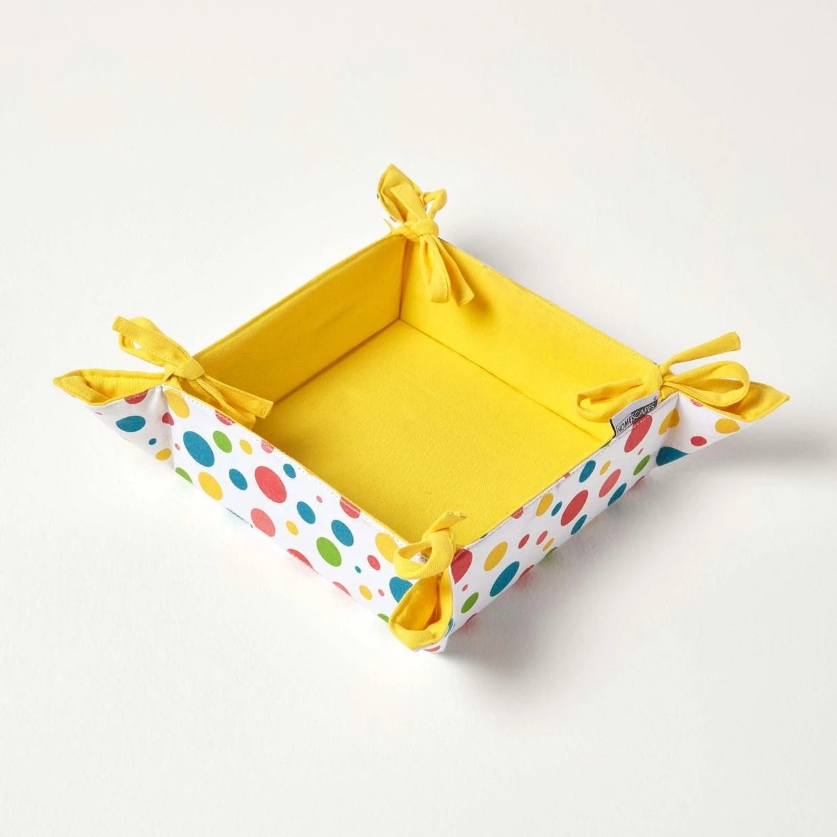 Faltbarer Frühstückskorb Polka Dots Multi. Brotkörbe sind nicht nur praktisch, sondern auch perfekt um Ihren Esstisch dekorativ aufzuwerten. Homescapes kombiniert Funktionalität mit farbenfrohen Mustern und bietet Ihnen insgesamt 15 einzigartige Stoffbrotkörbe. Die quadratischen Körbe sind aus 100% Baumwolle hergestellt und am Boden und an den Seiten verstärkt. Dank der Bänder in allen 4 Ecken können Sie sich ganz einfach wenden oder auseinander falten wenn Sie sich nicht nutzen und platzsparend verstauen. Sie sehen besonders schön in Kombination mit unseren brandneuen Teekannenärmern und Rüschensitzkissen aus. Die Brotkörbchen zum Wenden können vielseitig eingesetzt werden, z.B. für Brötchen, Brot, Eier oder einfach als Dekokörbe und sind mit einem Laib Brot und Salz das perfekte Mitbringsel zur Einweihungsparty.