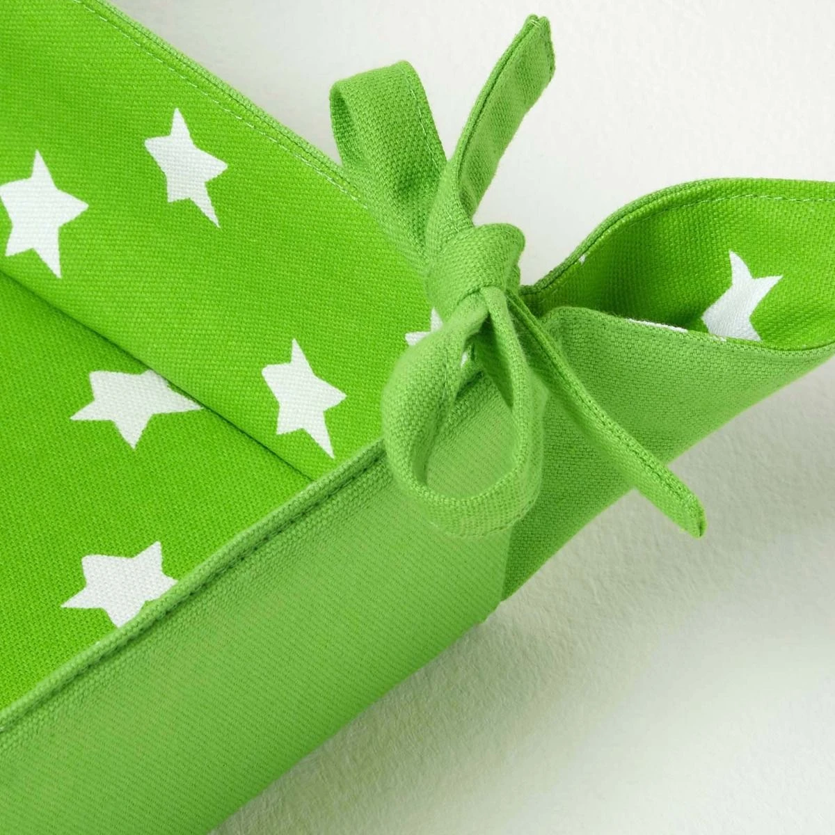 Faltbarer Frühstückskorb Sterne grün. Brotkörbe sind nicht nur praktisch, sondern auch perfekt um Ihren Esstisch dekorativ aufzuwerten. Homescapes kombiniert Funktionalität mit farbenfrohen Mustern und bietet Ihnen insgesamt 15 einzigartige Stoffbrotkörbe. Die quadratischen Körbe sind aus 100% Baumwolle hergestellt und am Boden und an den Seiten verstärkt. Dank der Bänder in allen 4 Ecken können Sie sich ganz einfach wenden oder auseinander falten wenn Sie sich nicht nutzen und platzsparend verstauen. Sie sehen besonders schön in Kombination mit unseren brandneuen Teekannenärmern und Rüschensitzkissen aus. Die Brotkörbchen zum Wenden können vielseitig eingesetzt werden, z.B. für Brötchen, Brot, Eier oder einfach als Dekokörbe und sind mit einem Laib Brot und Salz das perfekte Mitbringsel zur Einweihungsparty.