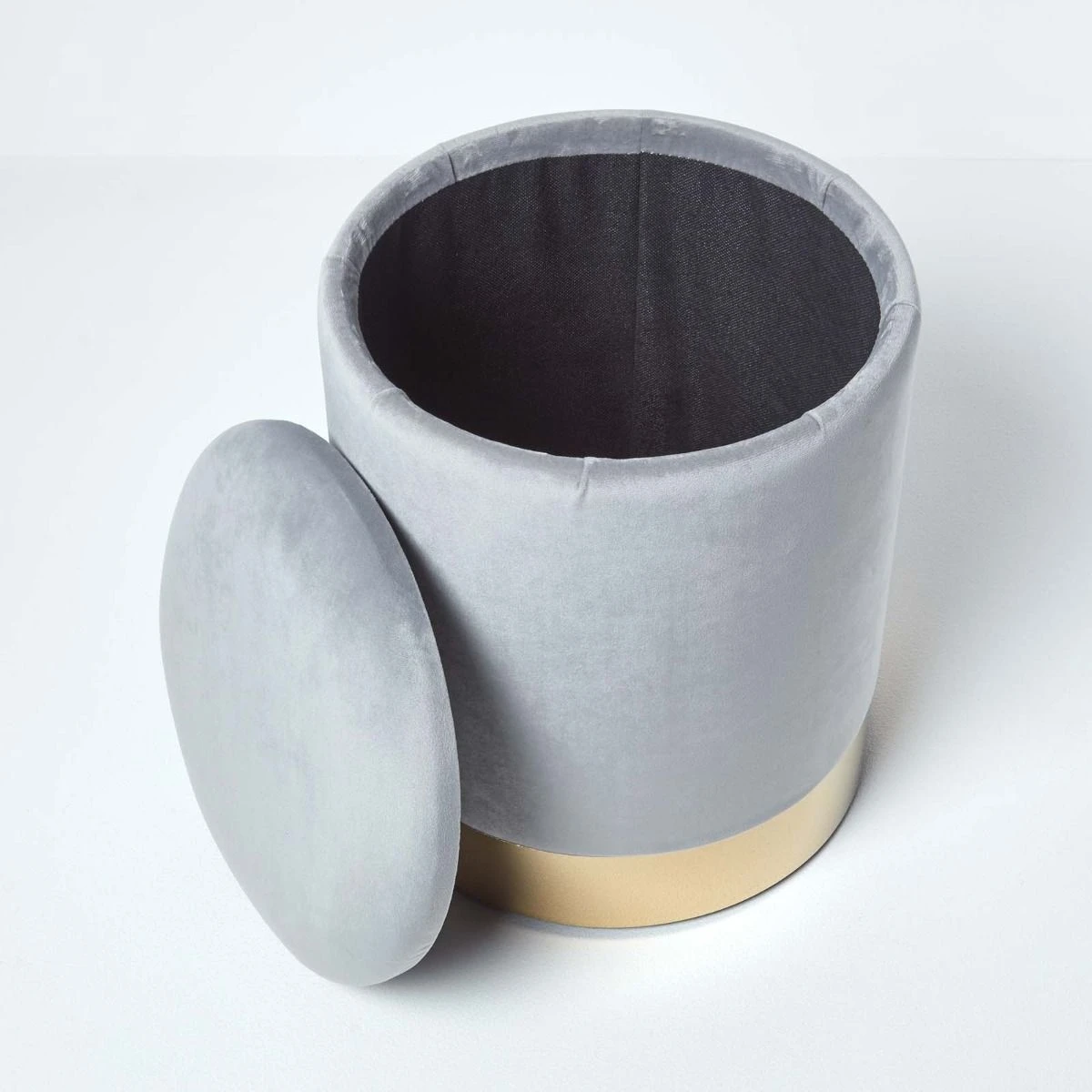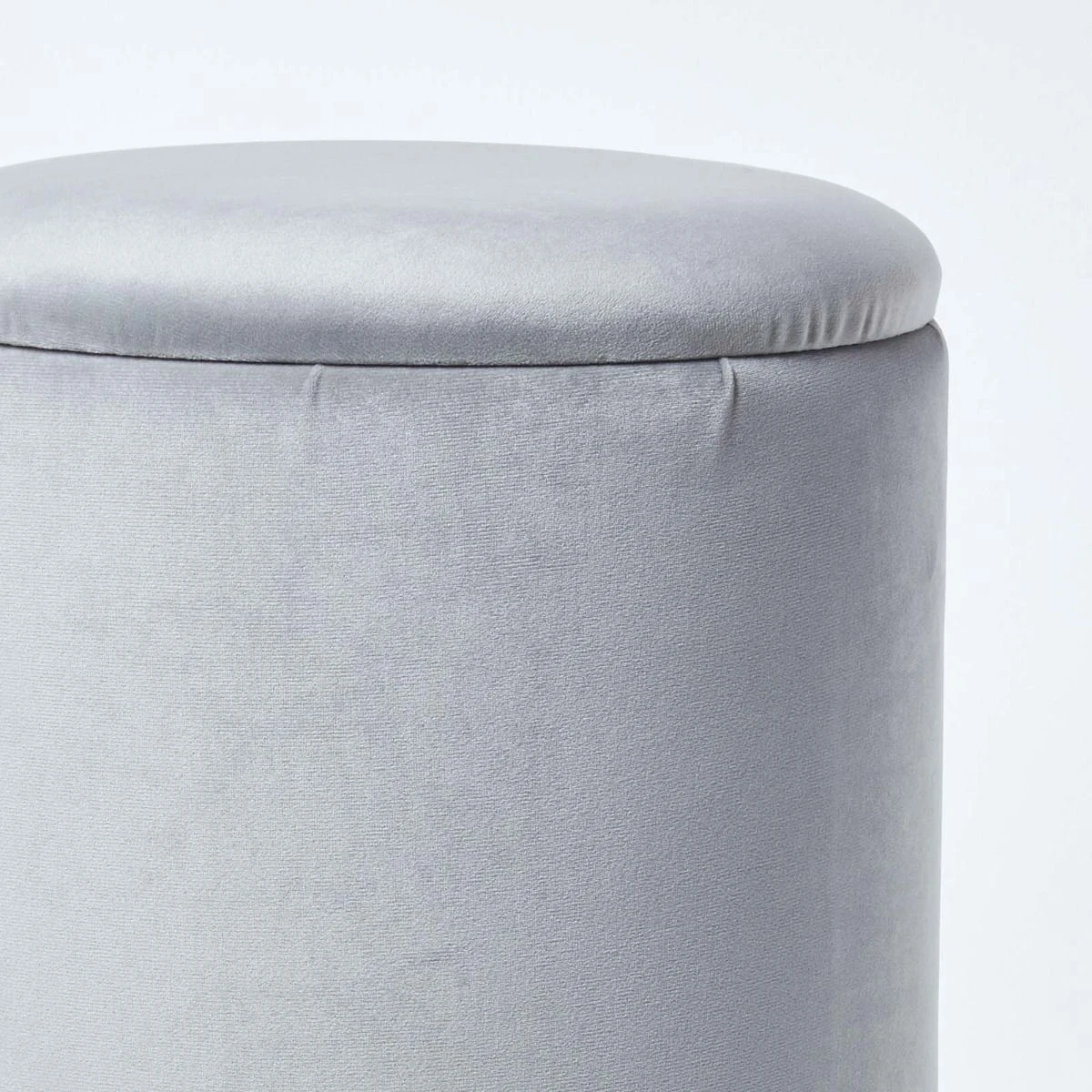 Grauer Sitzhocker mit Stauraum und luxuriösem Samtbezug von Homescapes‘ Sitzmöbel Kollektion. Runder Pouf mit Deckel, als Aufbewahrungsbox, Fußbank oder Nachttisch einsetzbar.