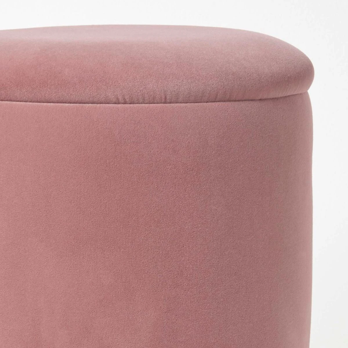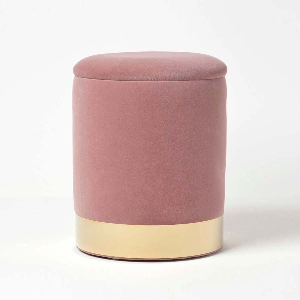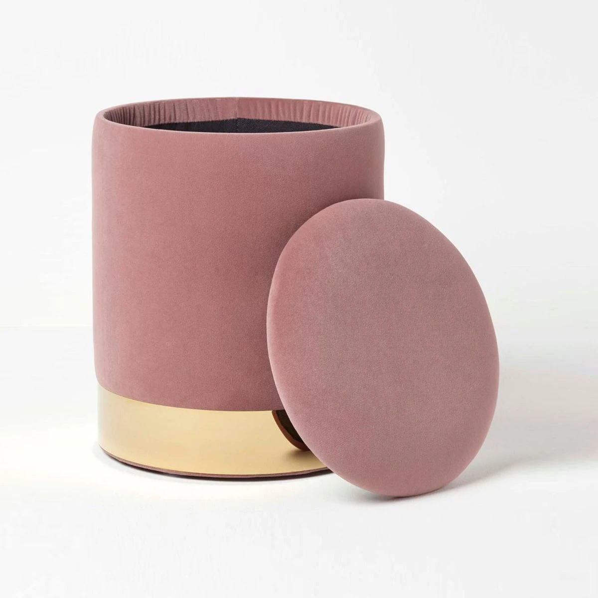 Pinker Samtpouf mit Stauraum und Messingrand. Gepolsterter Sitzpouf mit abnehmbarem Deckel, der ideal als Sitzgelegenheit, Aufbewahrungsbox, oder Fußhocker eingesetzt werden kann.
