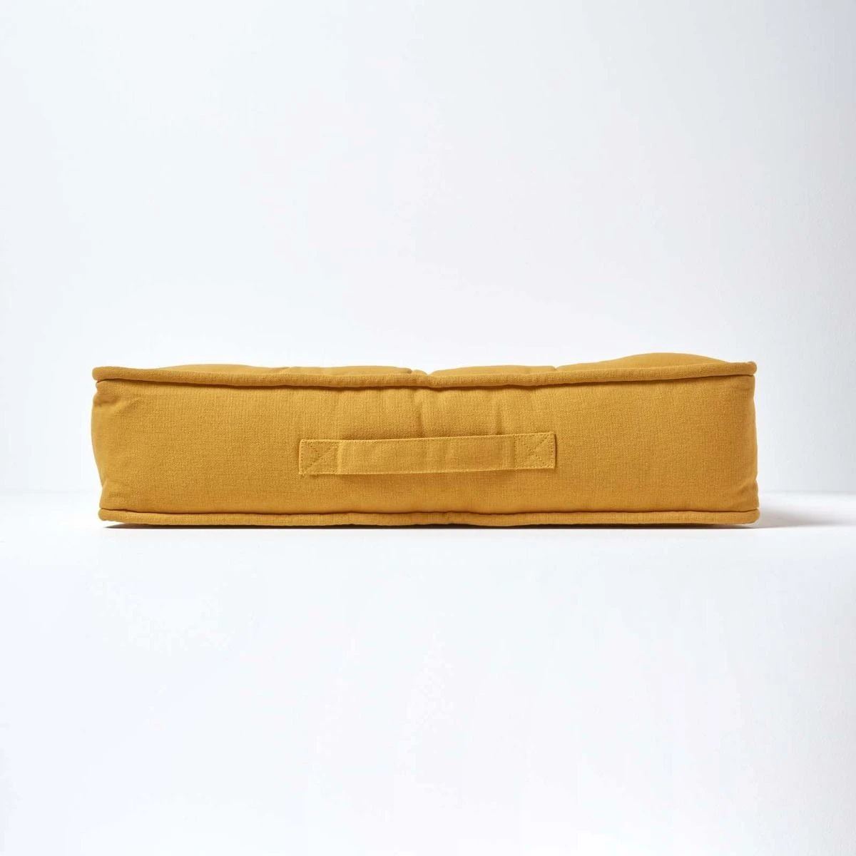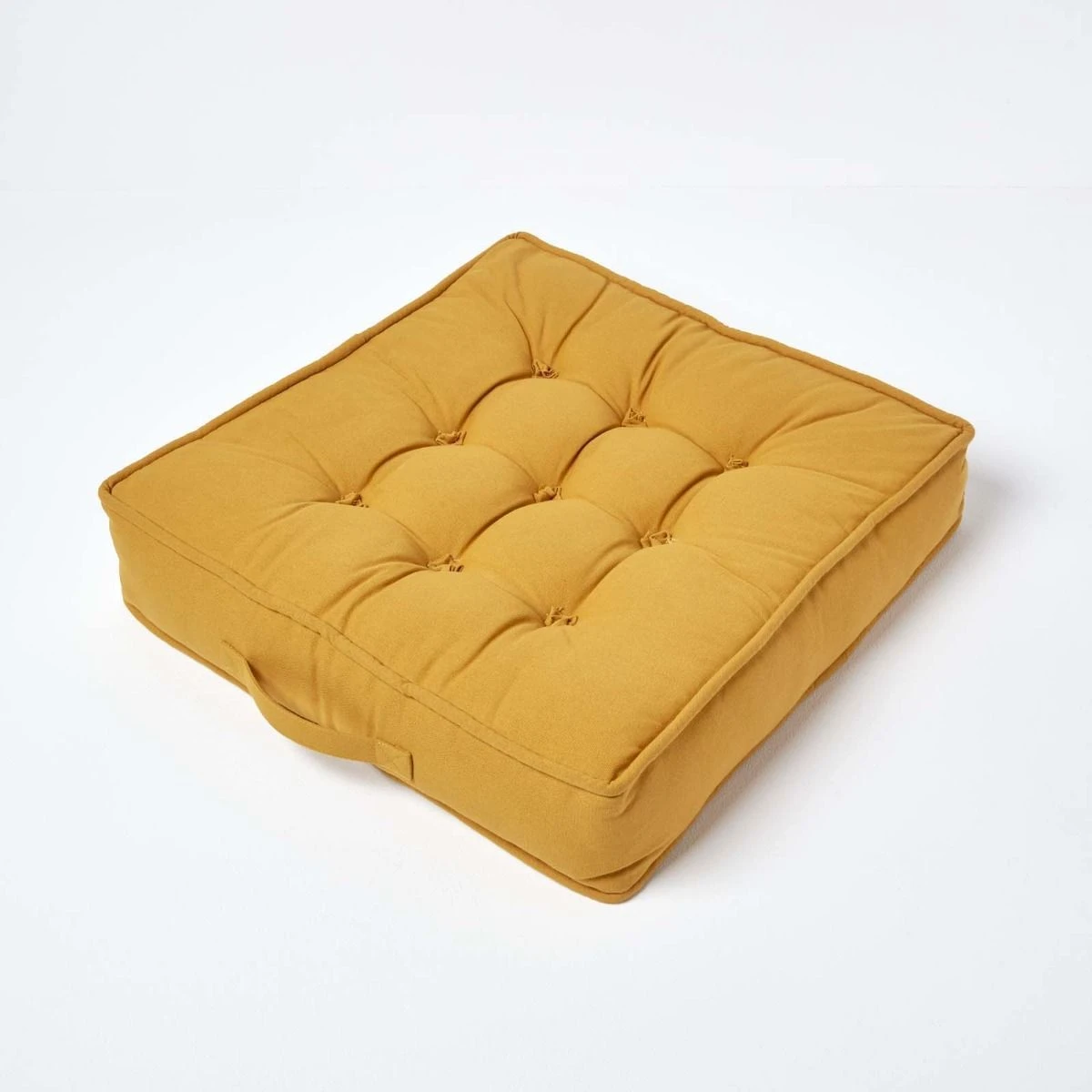 Festes und doch bequemes Sesselkissen für dauerhafte Unterstützung beim Sitzen. Das senfgelbe Kissen hat einen strapazierfähigen Baumwollbezug. Es ist 50 x 50 cm groß und komfortable 10 cm dick.