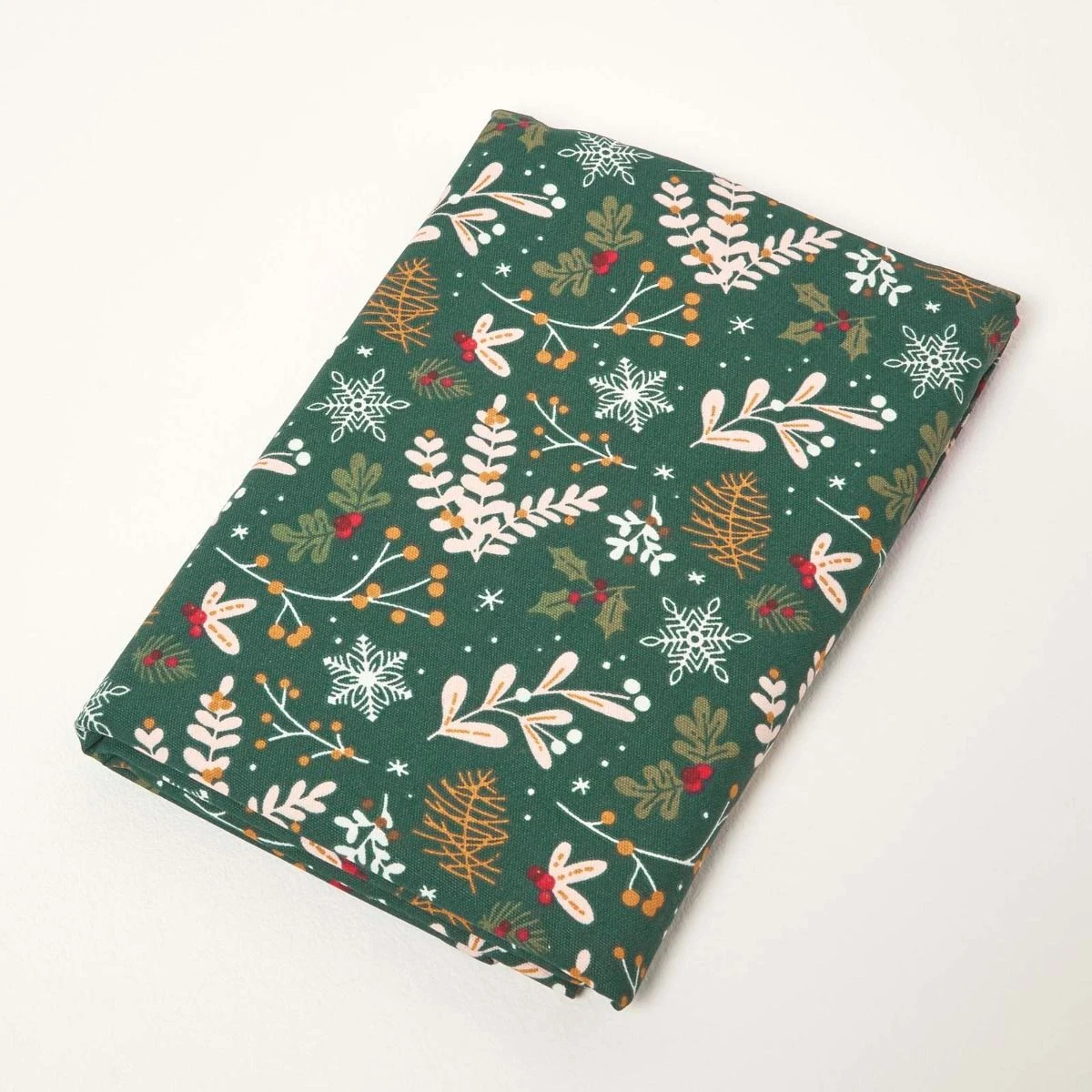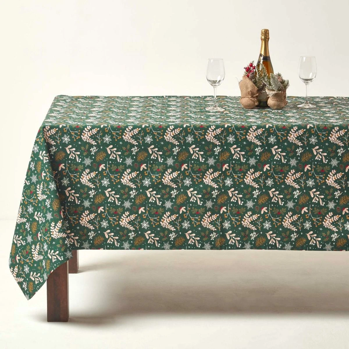 Moderne, festliche grüne Weihnachtstischdecke mit floralem Tannenzapfen-, Stechpalmen- und Beeren-Design. Farbenfrohe Baumwolltischdecke aus Homescapes Kollektion Weihnachtlicher Wald.