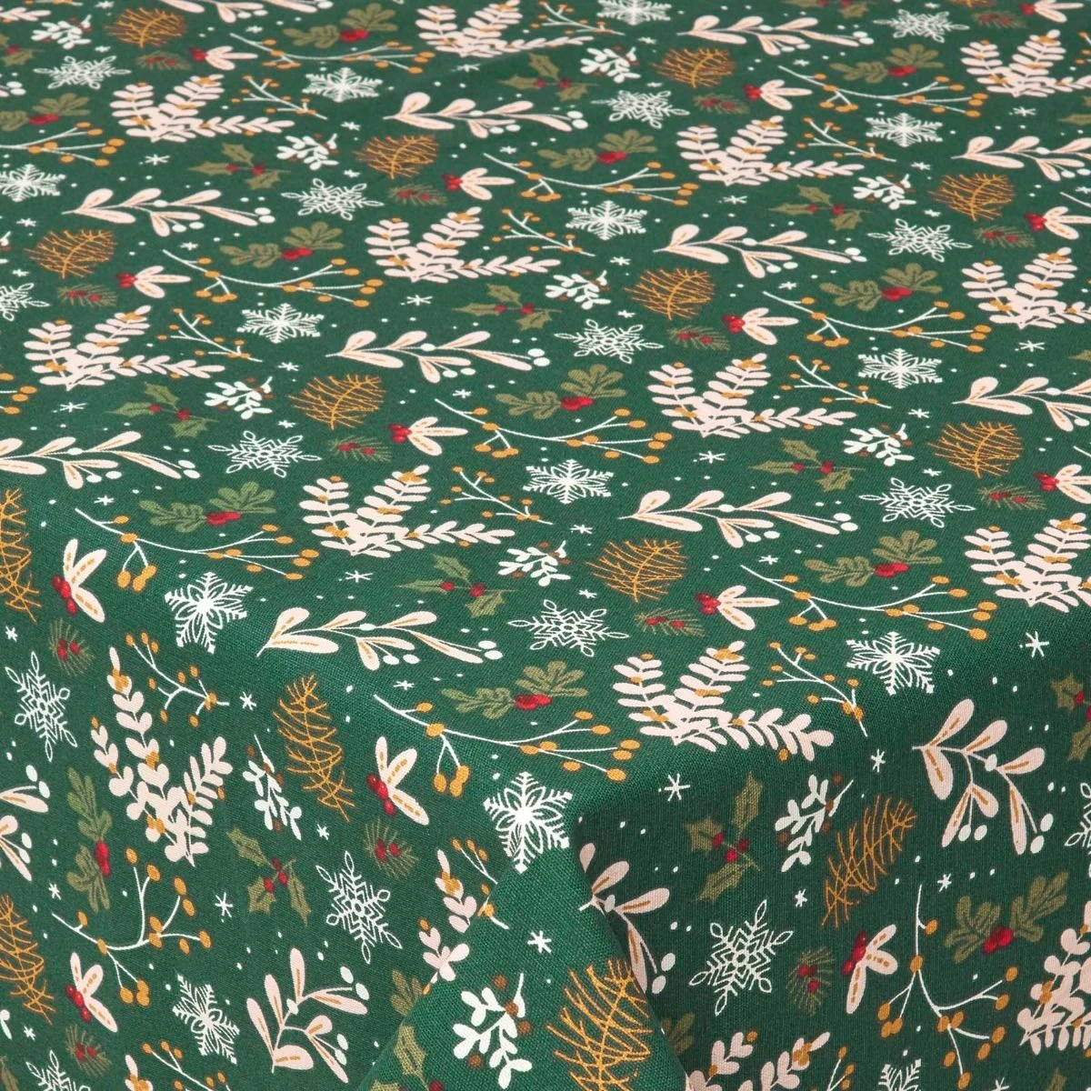 Ein traditionelles Tischtuch mit einem modernen Twist – die fröhliche und florale Weihnachtstischdecke wird diesen Dezember Weihnachtsstimmung in Ihr Heim bringen. Geschmückt mit Stechpalmen, Beeren und Schneeflocken vor einem tiefgrünen weihnachtlichen Hintergrund passt sie zu jeder Weihnachtseinrichtung. Die exklusive Kollektion schützt Tische vor dem unvermeidlichen kleinen Malheur und umfasst passende Tischsets, Läufer und Servietten.