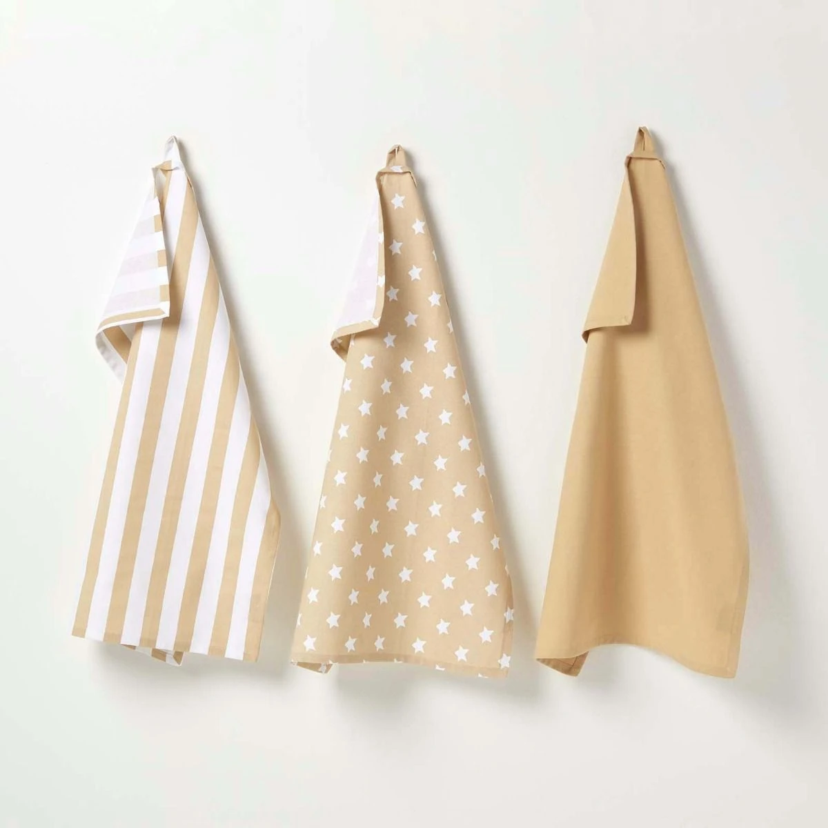 Farbenfrohe Geschirrtücher in beige gestreift, unifarben und mit weißen Sternen aus 100% Baumwolle – praktisch, funktional und dekorativ. Bringen Sie ein wenig frischen Wind und Farbe in Ihre Küche! Unser bedrucktes Küchentextilien-Sortiment besteht aus Küchenschürzen mit praktischer Bauchtasche, Topflappen, Ofenhandschuhen (einzeln und doppelt) und Geschirrtüchern im 3er Set in vielen witzigen Print-Designs(z.B. Schmetterling, Vogel auf Leine, Vögel & Blumen, Paisley & Dots, Eule uvm.). Da ist garantiert für jeden das Richtige dabei! Unsere Küchentextilien sind auf unsere Heimtextilien abgestimmt und können somit prima miteinander kombiniert werden.