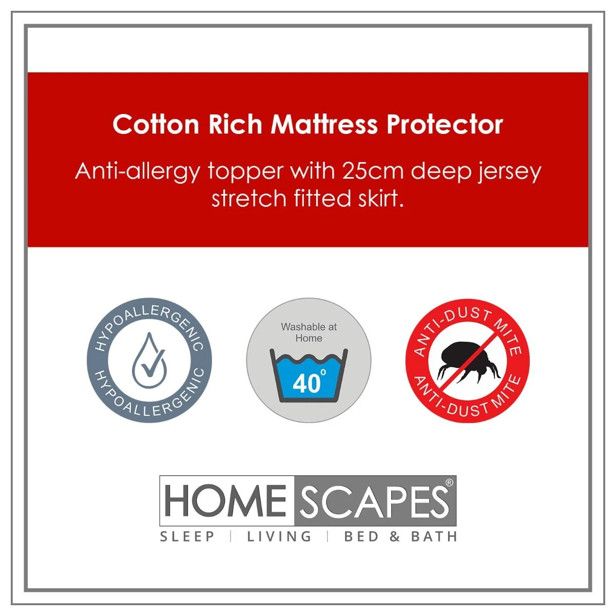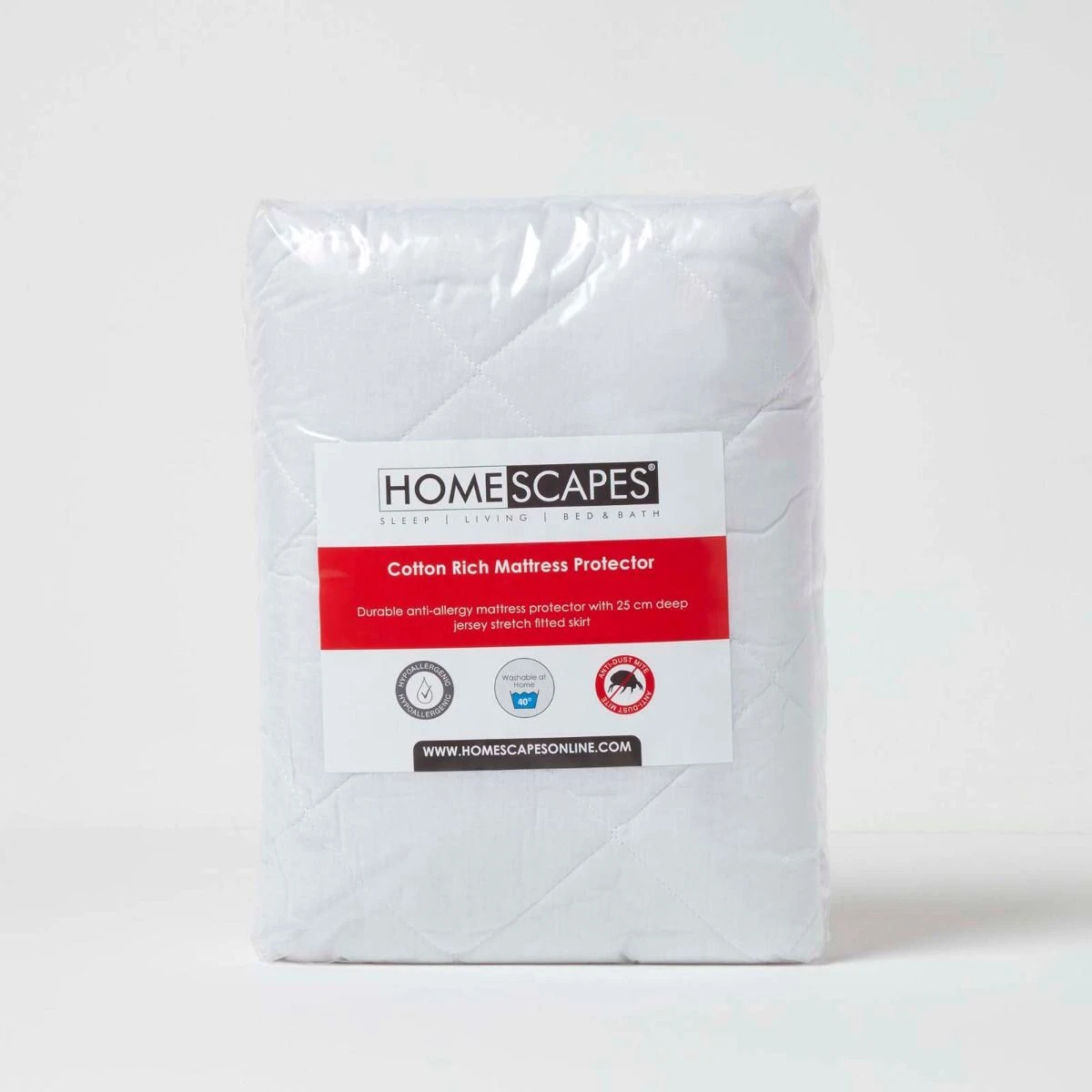 Homescapes’ budgetfreundlicher Matratzenschoner ist jetzt in einer neuen, verbesserten Ausführung erhältlich. Die Liegefläche besteht aus einem hautsympathischen und robusten Baumwoll-Polyester-Gemisch. Die komfortable Polyesterfüllung hat eine Grammatur von 70 g/m². Die 25 cm hohe Spannumrandung aus haltbarem Jersey-Stretch sorgt zuverlässig dafür, dass der Matratzenschoner nicht verrutscht und passt auch auf höhere Matratzen. Dank der Fertigung aus hypoallergenen, milbenabweisenden Materialien eignet sich die Matratzenauflage auch für Allergiker. Der gepolsterte Matratzenschonbezug kann bei 40 °C in die Waschmaschine und bei niedriger Temperatur getrocknet werden. Er ist ideal zur alltäglichen Nutzung und eignet sich auch hervorragend für Studentenwohnheime, Ferienwohnungen und mehr.