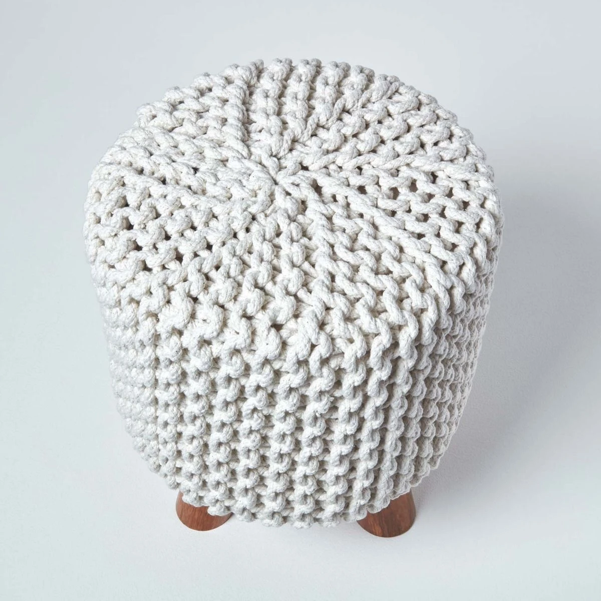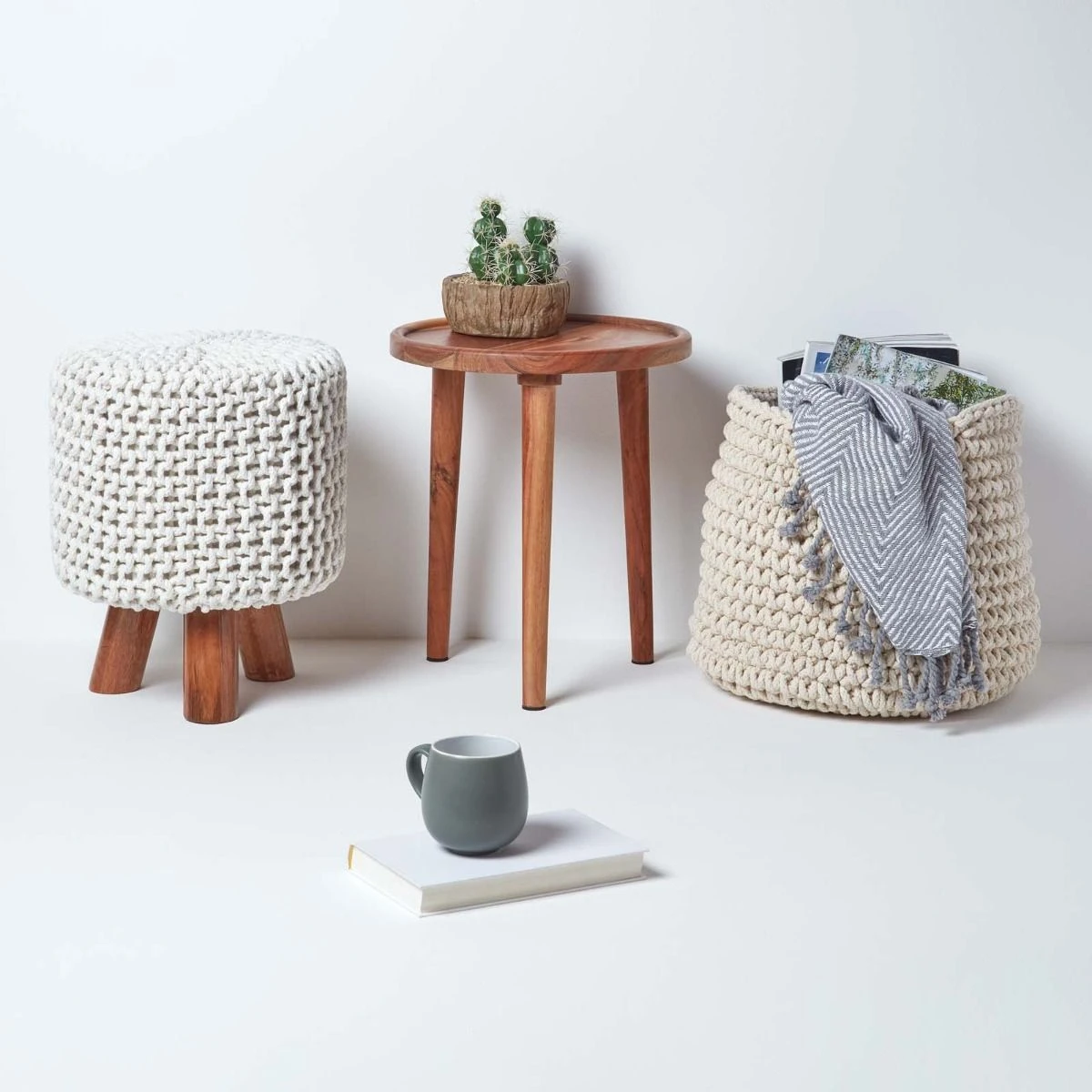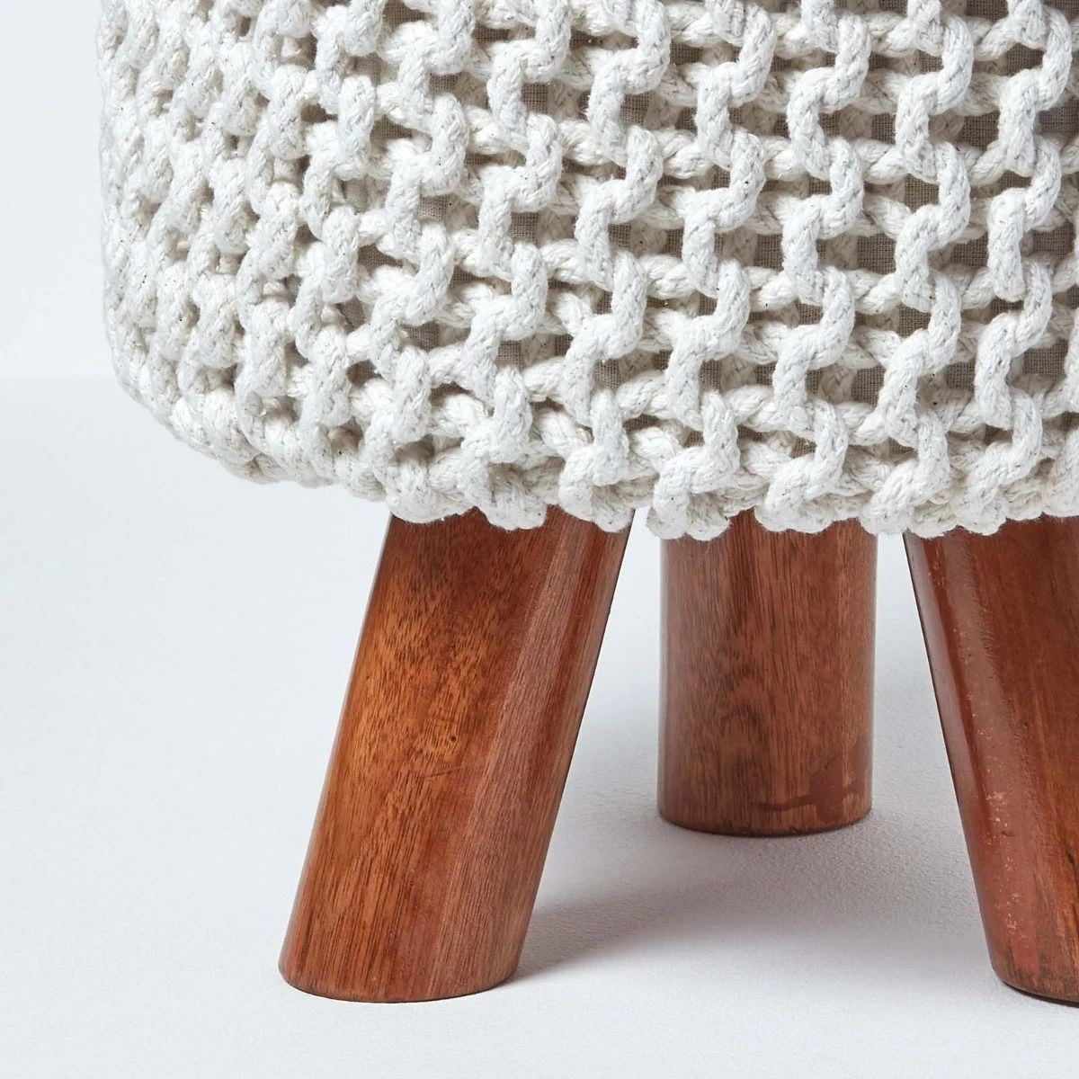 Vintage Hocker mit griffigem Bezug aus reiner Baumwolle in Grobstrick-Optik. Ausgestattet mit robusten Massivholzrahmen und drei Beinen.