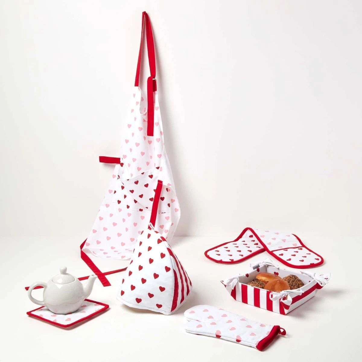 Farbenfrohe Küchenschürzen in weiß mit roten Bindebänder und roten Herzen in originellem Design aus 100% Baumwolle – praktisch, funktional und dekorativ. Bringen Sie ein wenig frischen Wind und Farbe in Ihre Küche! Unser bedrucktes Küchentextilien-Sortiment besteht aus Küchenschürzen mit praktischer Bauchtasche, Topflappen, Ofenhandschuhen (einzeln und doppelt) und Geschirrtüchern im 3er Set in vielen witzigen Print-Designs (z.B. Schmetterling, Vogel auf Leine, Vögel & Blumen, Paisley & Dots, Eule uvm.). Da ist garantiert für jeden das Richtige dabei! Unsere Küchentextilien sind auf unsere Heimtextilien abgestimmt und können somit prima miteinander kombiniert werden. Die bunten Schürzen verfügen über ein verstellbares Nackenband. Sie sind strapazierfähig und robust und können auch als Grillschürzen verwendet werden.