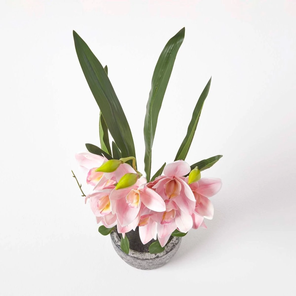 Bezaubernde, etwa 58 cm große künstliche Cymbidium Orchidee mit zarten, rosa Blüten in einem runden Steinoptik-Pflanztopf aus Beton.