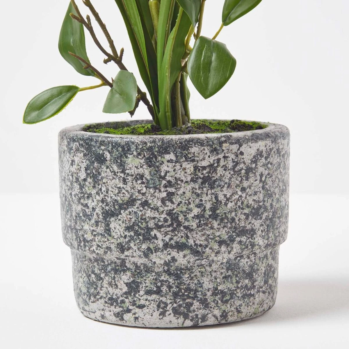 Künstliche Orchideen von Homescapes werden von fachkundig geschulten Experten sorgsam und mit botanischer Genauigkeit von Hand gefertigt. Die aus hochwertigem, seidenartigem Material gearbeiteten Blüten sehen daher besonders realistisch und lebendig aus. Die ebenso naturgetreuen Knospen und Blätter unterstreichen effektvoll diesen Eindruck. Unsere Kunstorchideen sorgen in jedem Raum für florales Flair und einen exotischen Touch. Sie sind kaum von echten Pflanzen zu unterscheiden. Verschönern Sie Wohnbereiche oder Büroräume mit dieser wunderschönen Kunstblume, die Ihrer Einrichtung ein freundliches und entspannendes Ambiente verleiht. Der mit Kunsterde und Kunstmoos ausgestattete graue Topf harmoniert mit modernen wie rustikaler gestalteten Interieurs.