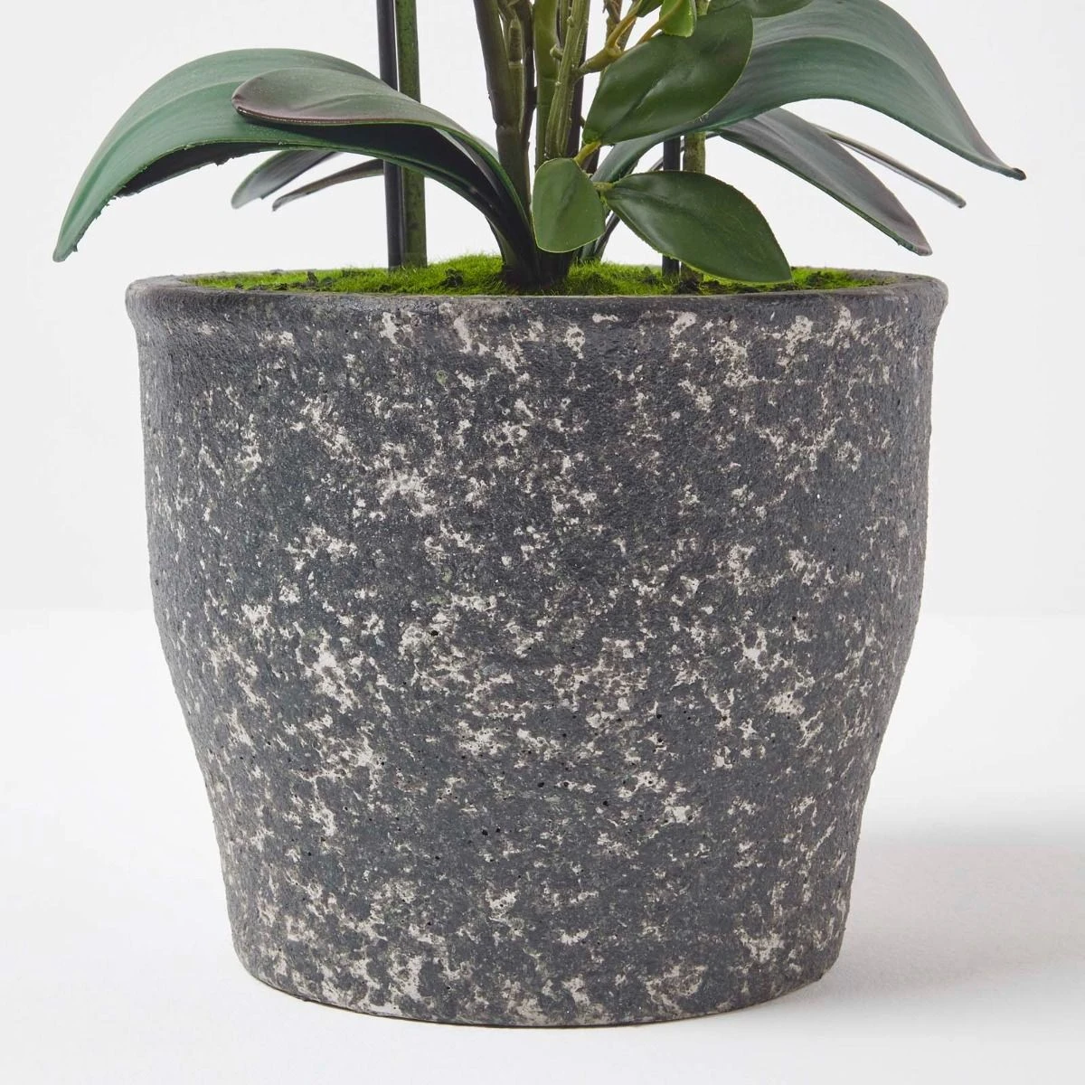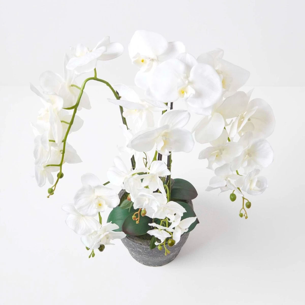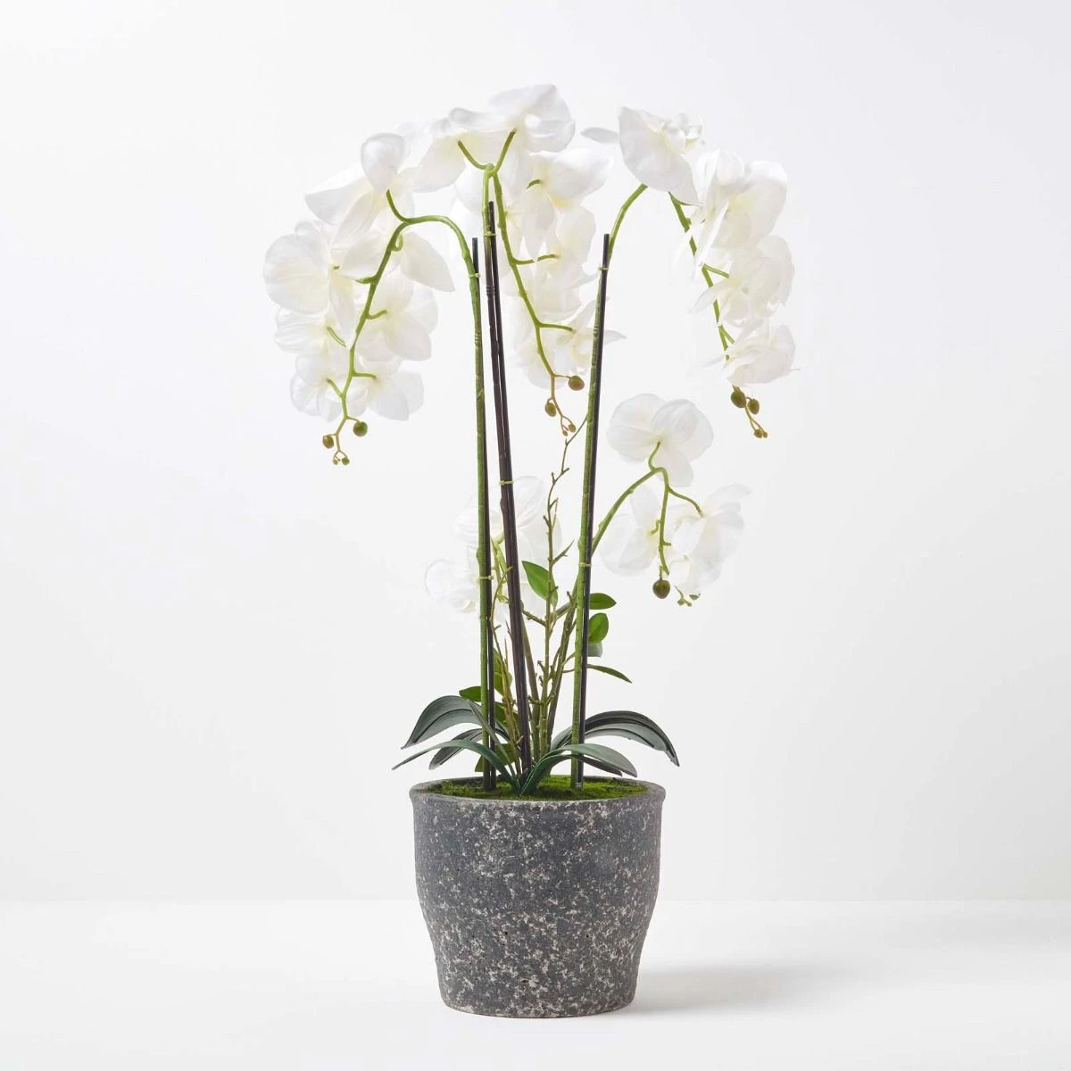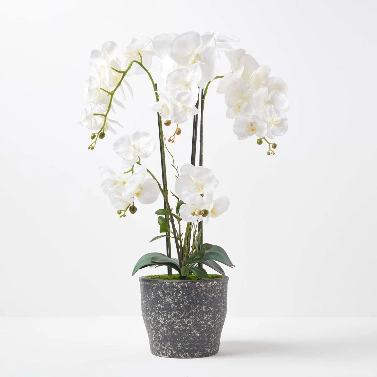 Künstliche Orchideen von Homescapes werden mit botanischer Genauigkeit von erfahrenen Experten sorgsam handgefertigt. Die aus einem hochwertigen, seidenartigen Material gearbeiteten weißen Blüten sehen daher besonders realistisch aus. Die ebenso naturgetreuen Knospen und Blätter unterstreichen effektvoll diesen Eindruck. Unsere Kunstorchideen sorgen in jedem Raum für einen exotischen Touch und florales Flair und sind von echten Pflanzen kaum zu unterscheiden. Dekorieren Sie Wohnbereiche oder Büroräume mit dieser wunderschönen Kunstblume, die Ihrer Einrichtung ein lebendiges Ambiente verleiht. Der mit Kunsterde und Kunstmoos ausgestattete dunkelgraue Topf harmoniert besonders gut mit modernen Interieurs, passt aber zu nahezu jedem Einrichtungsstil.