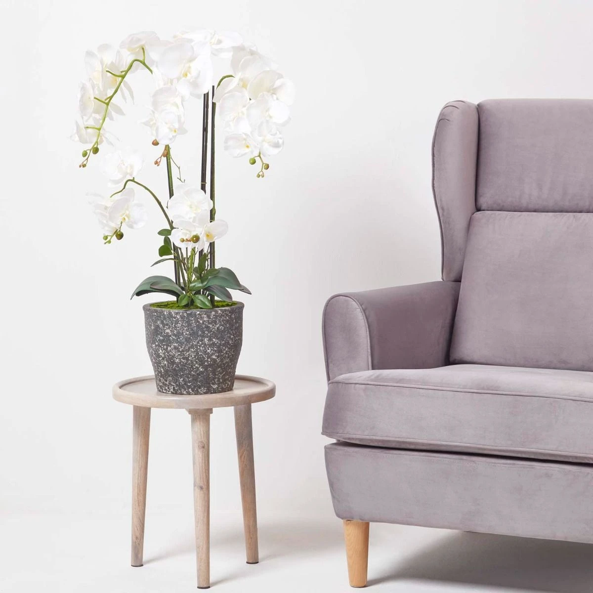 Beeindruckende, etwa 82 cm große künstliche Phalaenopsis Orchidee mit weißen Blüten in einem dekorativen, grauen Pflanztopf aus Beton.