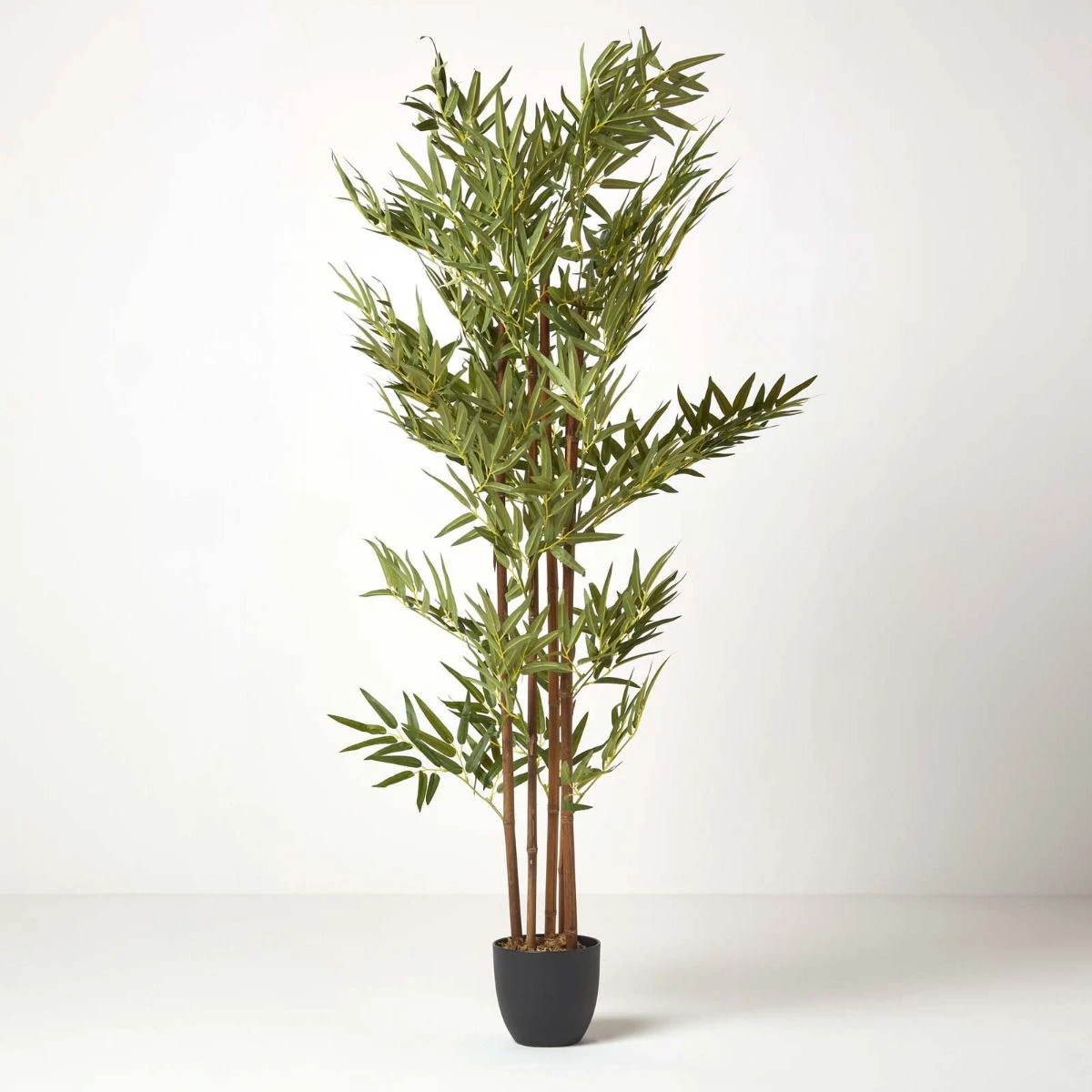 Naturgetreu gestalteter künstlicher Bambus in einem schwarzen Topf. Die realistische, etwa 155 cm große Kunstpflanze ist ideal, um ein wenig fernöstliches Flair in Ihre Einrichtung zu bringen.