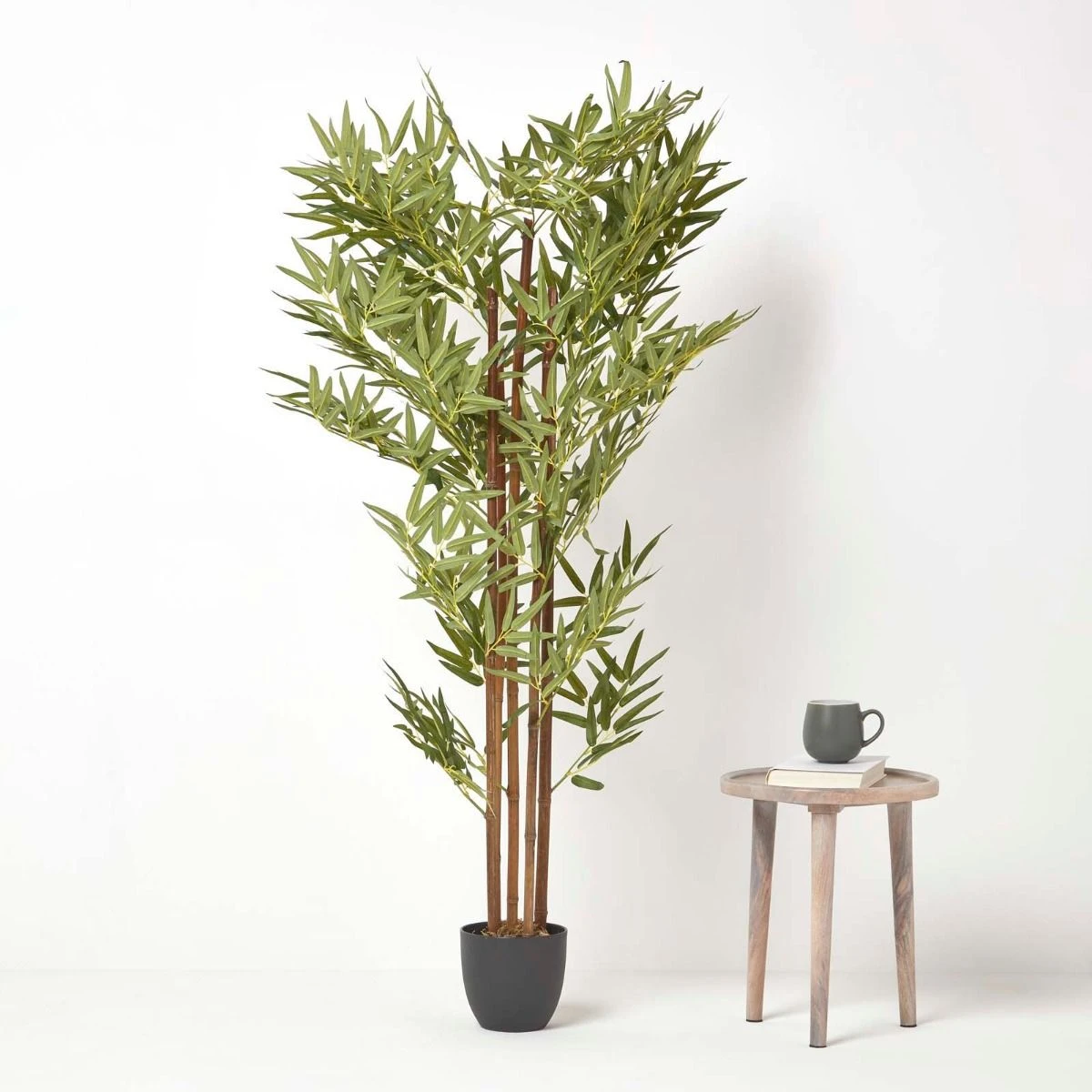 Der künstliche Bambus sieht aus wie echt und ist perfekt, um frisches Grün in Wohnräume, Büros oder Praxisräume zu bringen, die lebenden Pflanzen oft keine guten Bedingungen bieten. Auch die aufwändige Pflege, die echte Pflanzen mitunter erfordern, entfällt. Ideal für Menschen ohne grünen Daumen oder mit wenig Zeit für die Pflanzenpflege. Für langjährig leuchtende Farben sind die sorgsam gefertigten Blätter mit einem UV-Schutz versehen. Der für ein besonders realistisches Erscheinungsbild mit Kunstmoos ausgestattete Topf kann problemlos in einen dekorativen Übertopf gestellt werden. So lässt sich die schöne Kunstpflanze an jeden Einrichtungsstil anpassen.