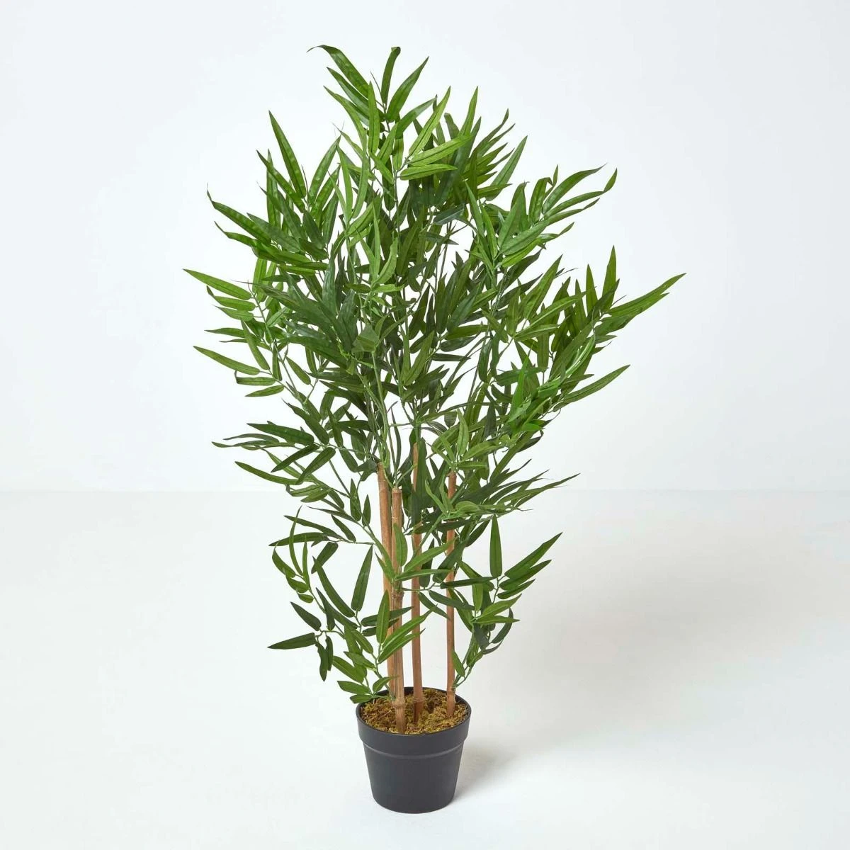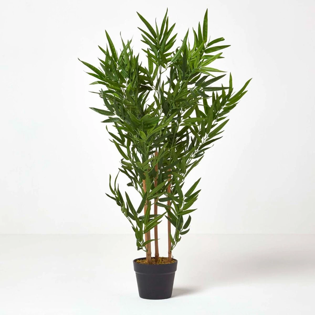 Erstaunlich realistischer Kunstbambus mit drei Halmen in einem schlichten, schwarzen Topf, etwa 95 cm groß – ideal, um in Ihrem Heim eine angenehm ausgeglichene, grüne Atmosphäre zu schaffen.