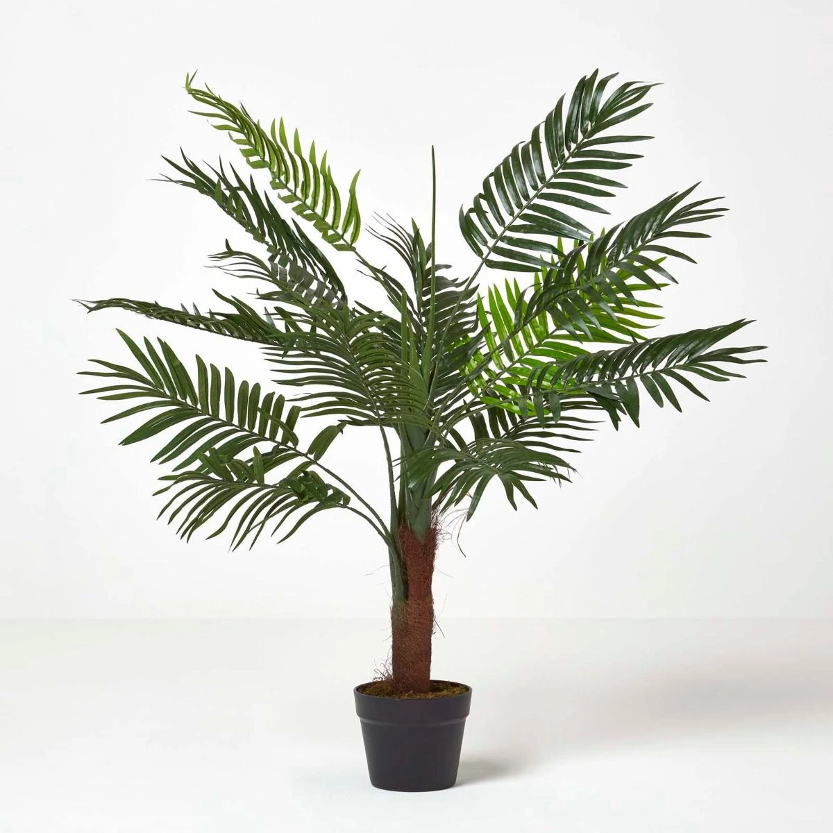 Bringen Sie angesagten Tropical Style in Ihr Zuhause. Die etwa 100 cm hohe künstliche Mini-Palme im schwarzen Topf ist kaum von einer echten zu unterscheiden und sorgt in jedem Raum für eine angenehme, florale Atmosphäre.