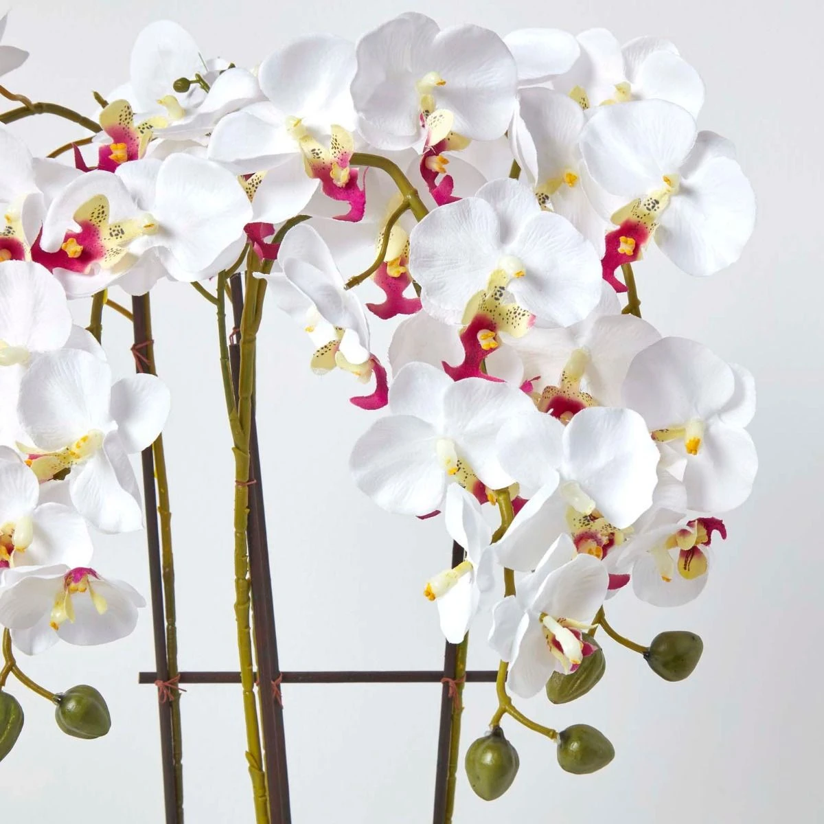 Große künstliche Orchidee in einem viereckigen, nach unten schmaler werdenden, dekorativen Topf. Die etwa 70 cm hohe weiße Orchidee mit lebhaften pinken und gelben Farbtupfern auf den Blüten wirkt ungewöhnlich realistisch und naturgetreu – die ideale Dekoration für eine angenehme Atmosphäre in Wohnräumen und Büros.