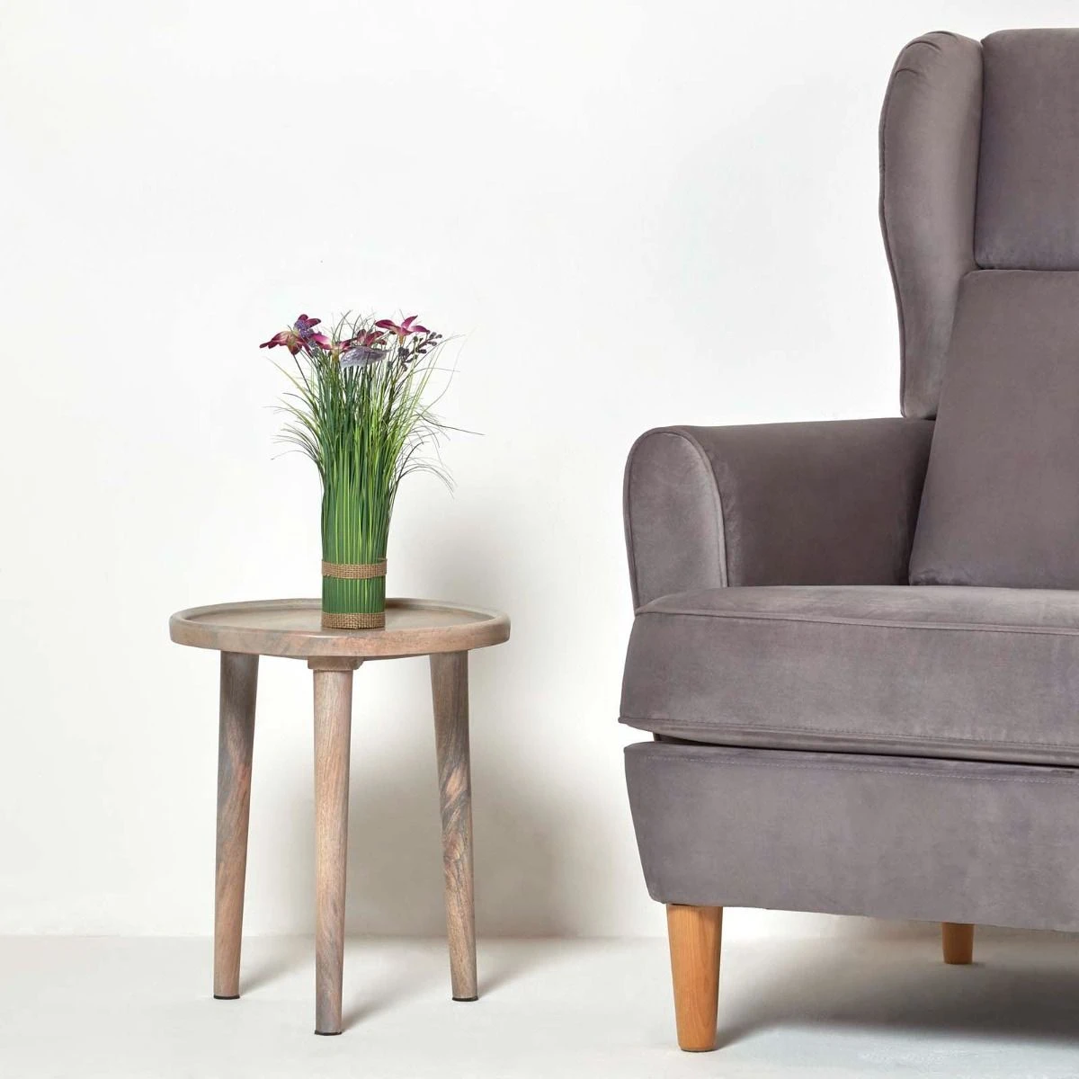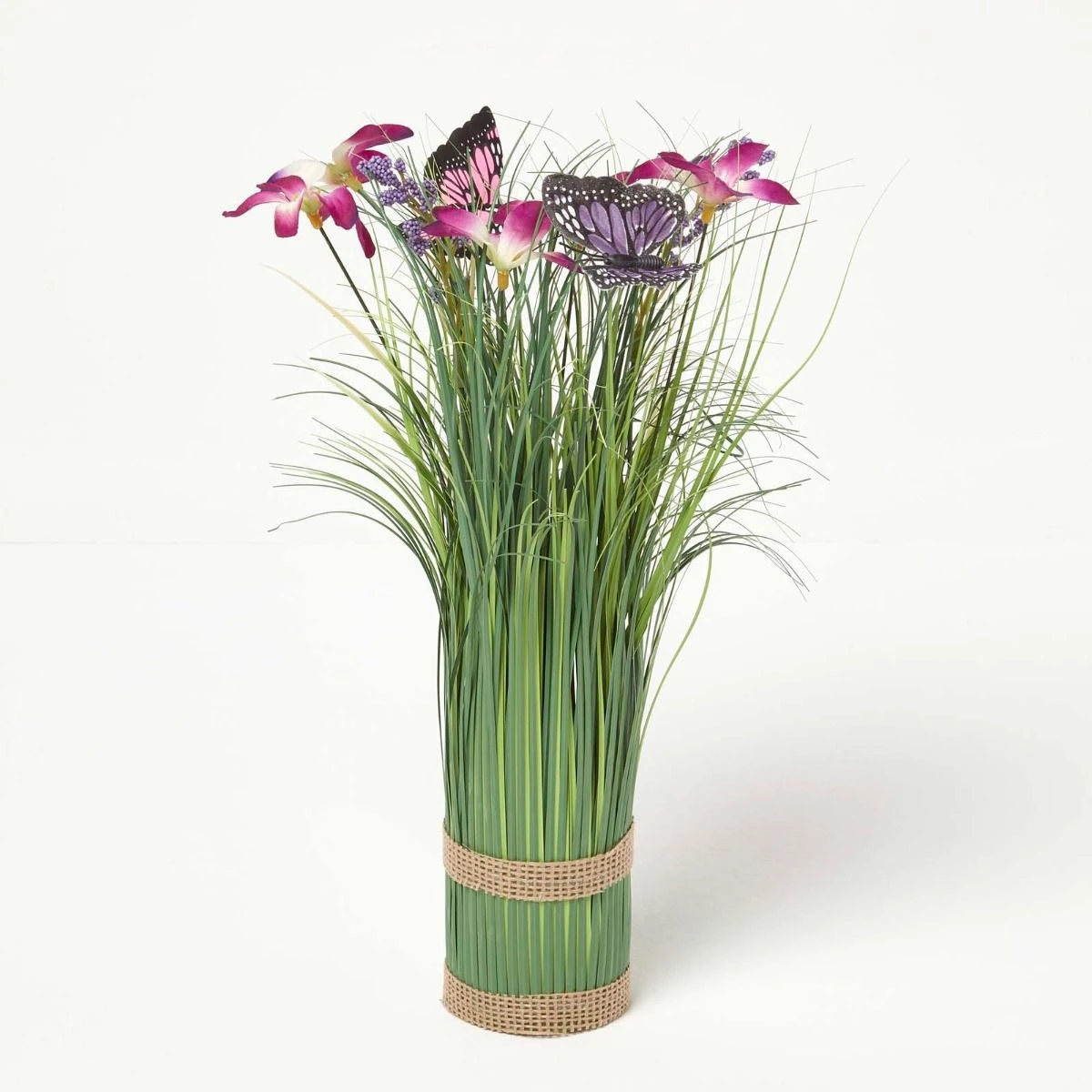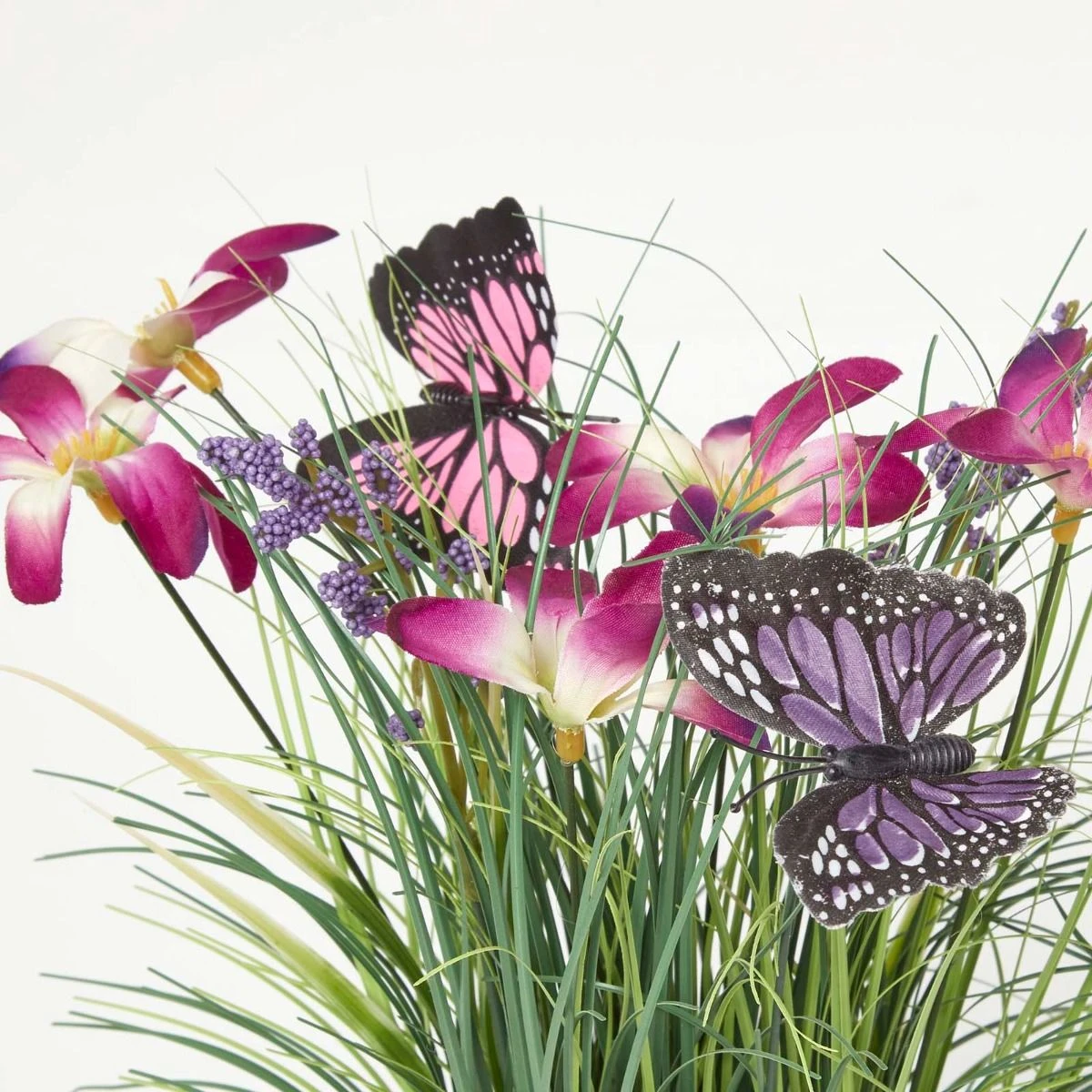 Holen Sie sich ganzjährig den Frühling ins Haus: lebensechte Kunstgras-Deko mit leuchtend violetten Blüten und filigranen Schmetterlingen. Das schmuckvolle Arrangement ist 35 cm groß und 15 cm breit.