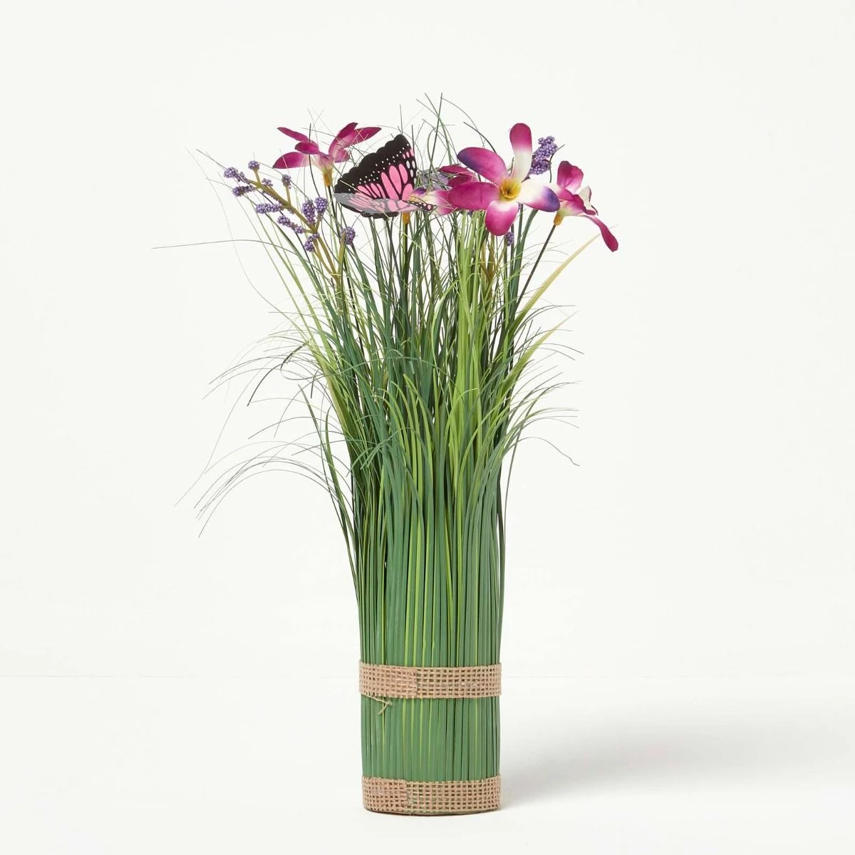 Zwei dekorative Bastbänder zieren die Basis der freistehenden Frühlings-Deko, die in jedem Heim für bezaubernde Farbakzente sorgt. Jede Blüte, jeder Halm und jeder Schmetterling wurden von erfahrenen Experten für ein realistisches Aussehen in sorgfältiger Handarbeit detailliert gestaltet. Das Ergebnis ist eine zauberhafte Dekoration, die völlig lebensecht wirkt, aber nie verwelkt.