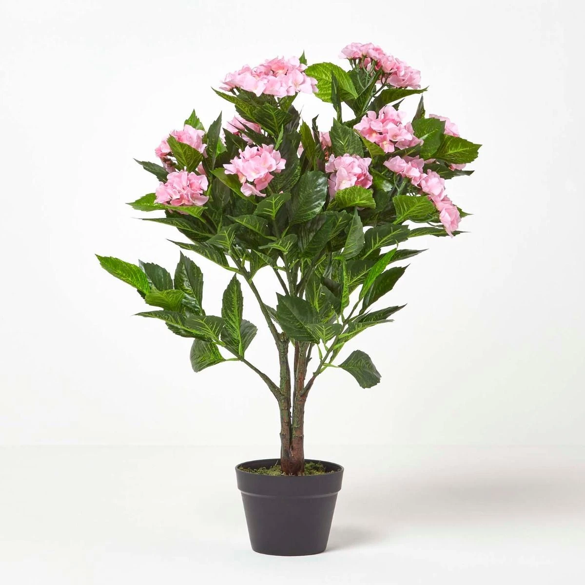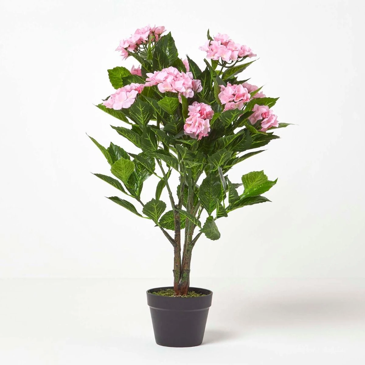Dekorieren Sie Ihr Heim mit diesem beeindruckend realistischen, rosa blühenden Hortensien-Strauch und holen Sie sich unabhängig von der Jahreszeit ein bisschen Sommer ins Haus. Die naturgetreu gestaltete Kunstpflanze kommt in einem schlichten, schwarzen Topf und ist etwa 85 cm groß.