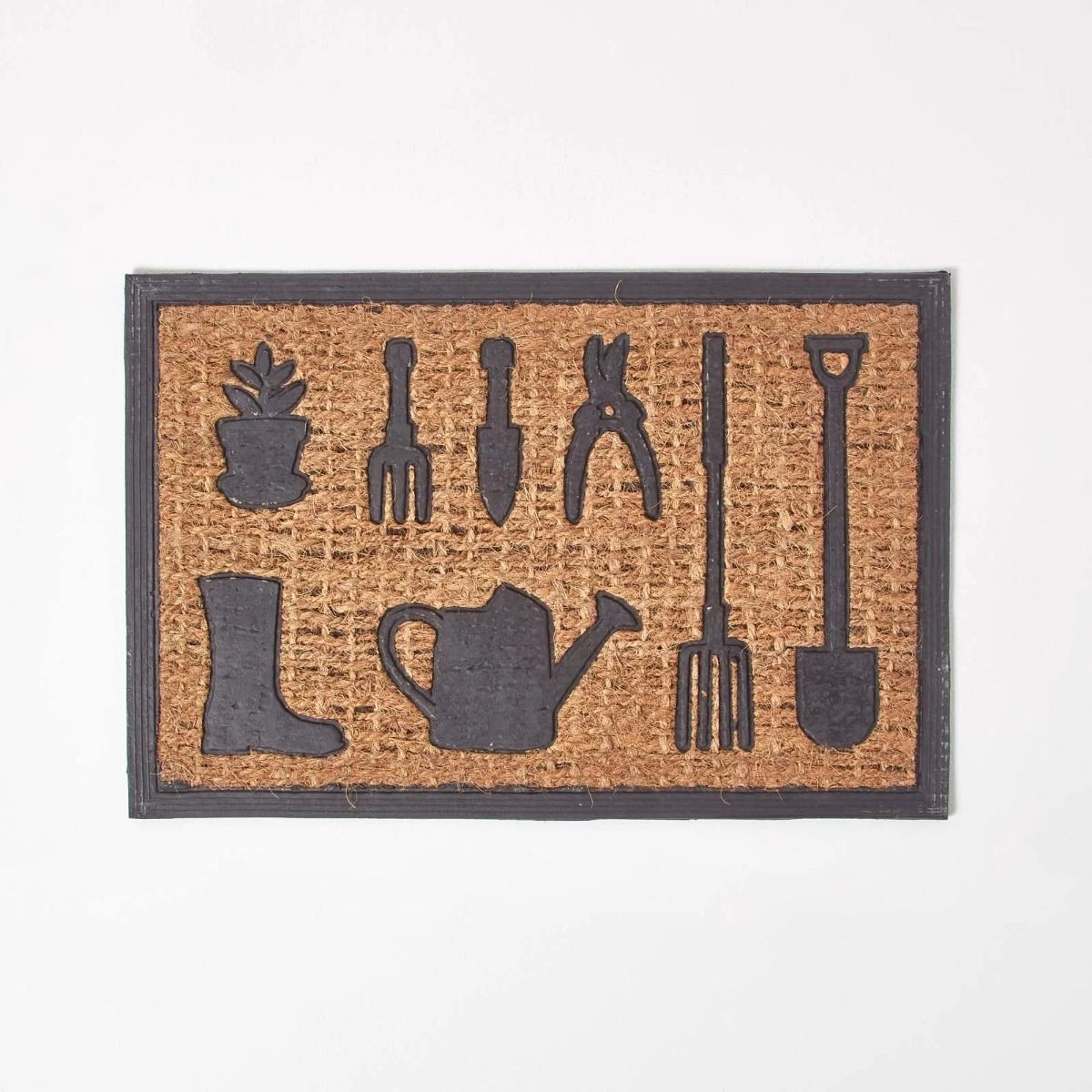 Diese Kokosmatte mit Gummi von Homescapes ist ideal für begeisterte Gärtner und eignet sich perfekt für Ihr Haus, Ihren Schuppen oder Ihr Gewächshaus. Die Türmatte zeigt die Formen eines Stiefels, eines Spatens, einer Gießkanne und weitere typische Gartenmotive. Ein tolles Geschenk für neue Hausbesitzer oder für Gartenliebhaber.