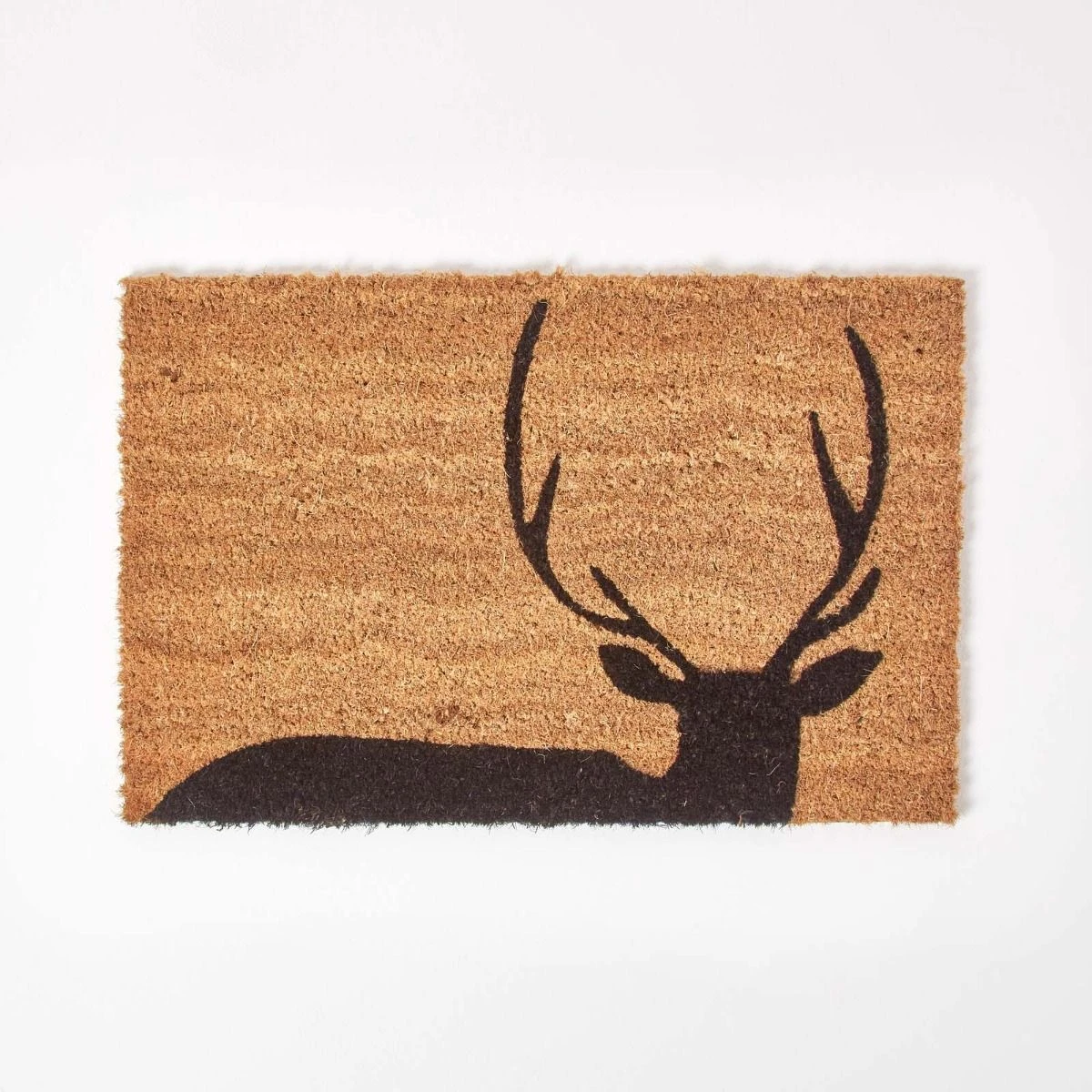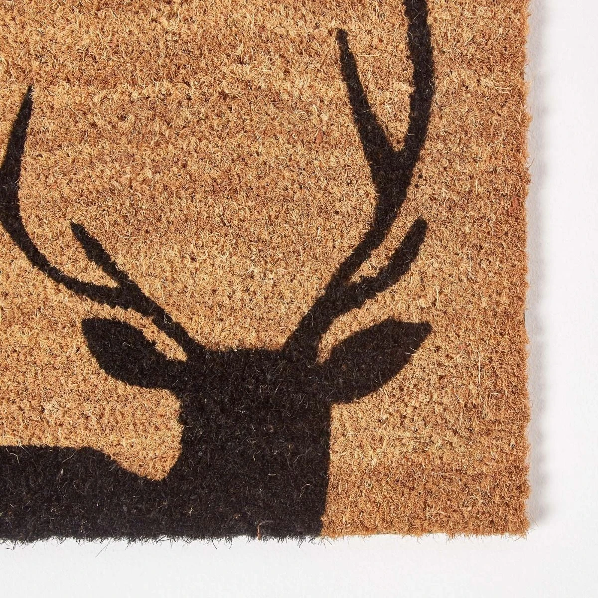 Rechteckige Kokosmatte mit schwarzer Hirsch-Silhouette: eine Türmatte im traditionellen Stil mit rutschfestem PVC-Rücken – gestaltet für den Innenbereich und perfekt für Tierliebhaber.