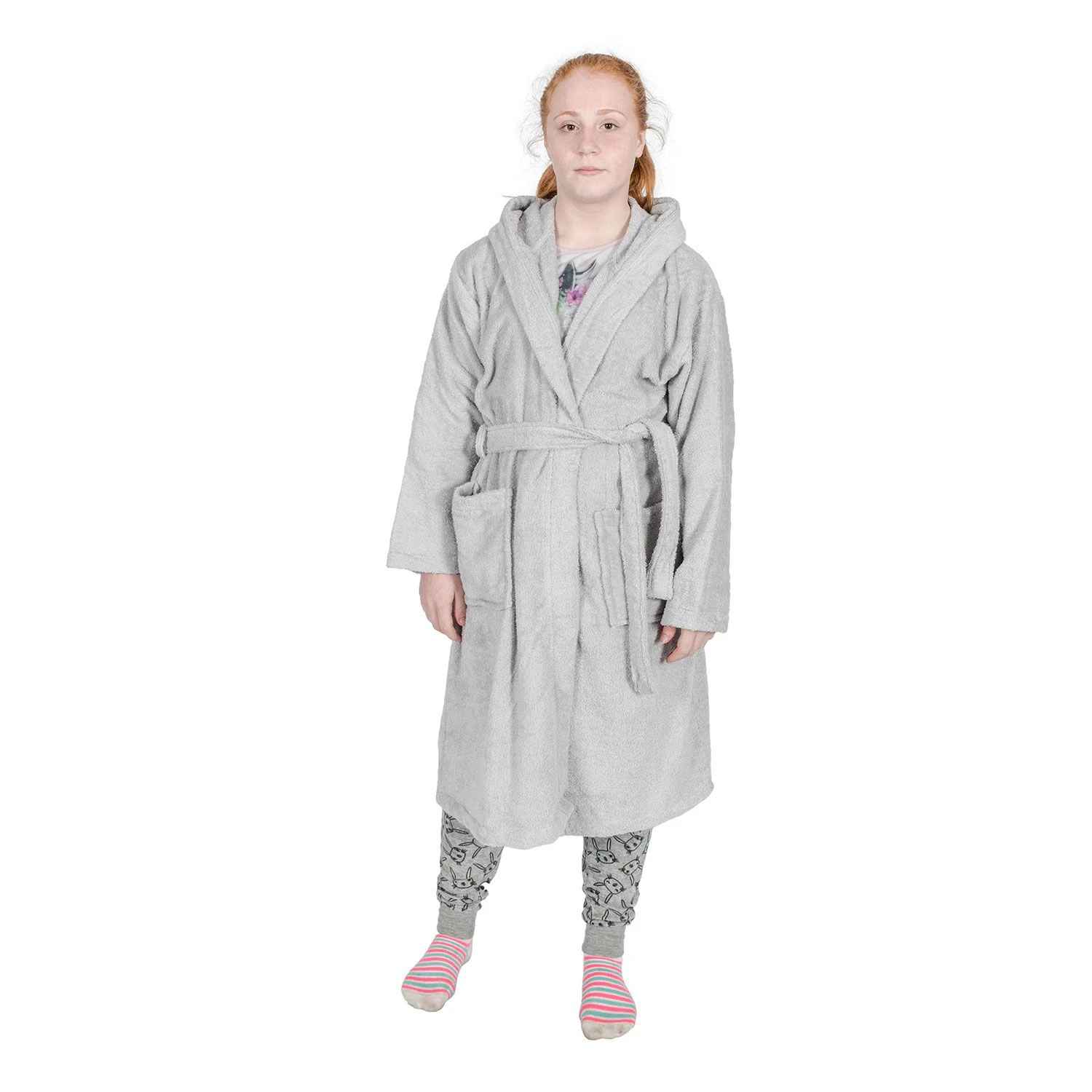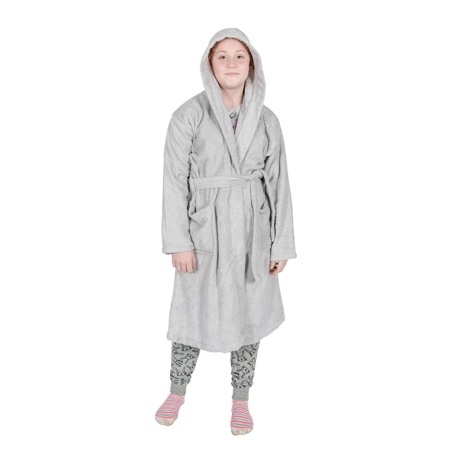 Kuschelig warmer Bademantel für Kinder aus Frotté mit Kapuze und zwei Taschen in Silbergrau aus hochwertigem, hautfreundlichem Frotteestoff, Homescapes