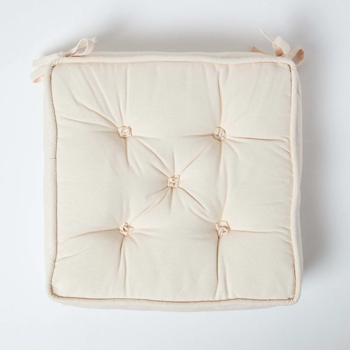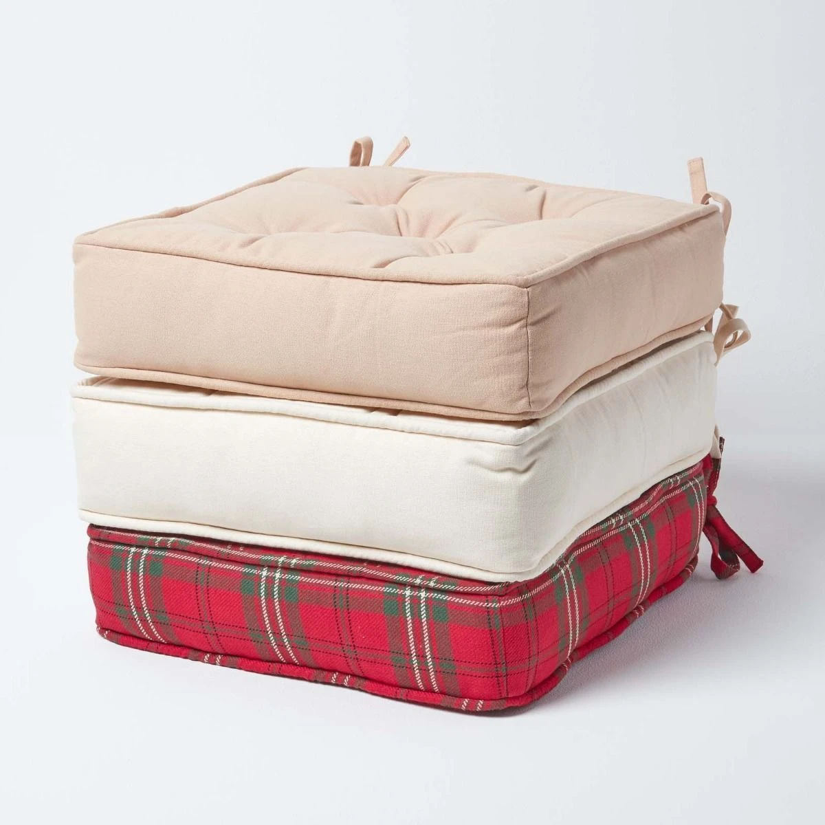 Festes und extra dickes Sitzkissen für Esszimmerstühle mit den Maßen 40 x 40 cm und komfortablen 10 cm Höhe. Das mit praktischen Bindebändern ausgestattete Kissen hat einen cremeweißen Baumwollbezug und bietet dauerhafte Unterstützung beim Sitzen.