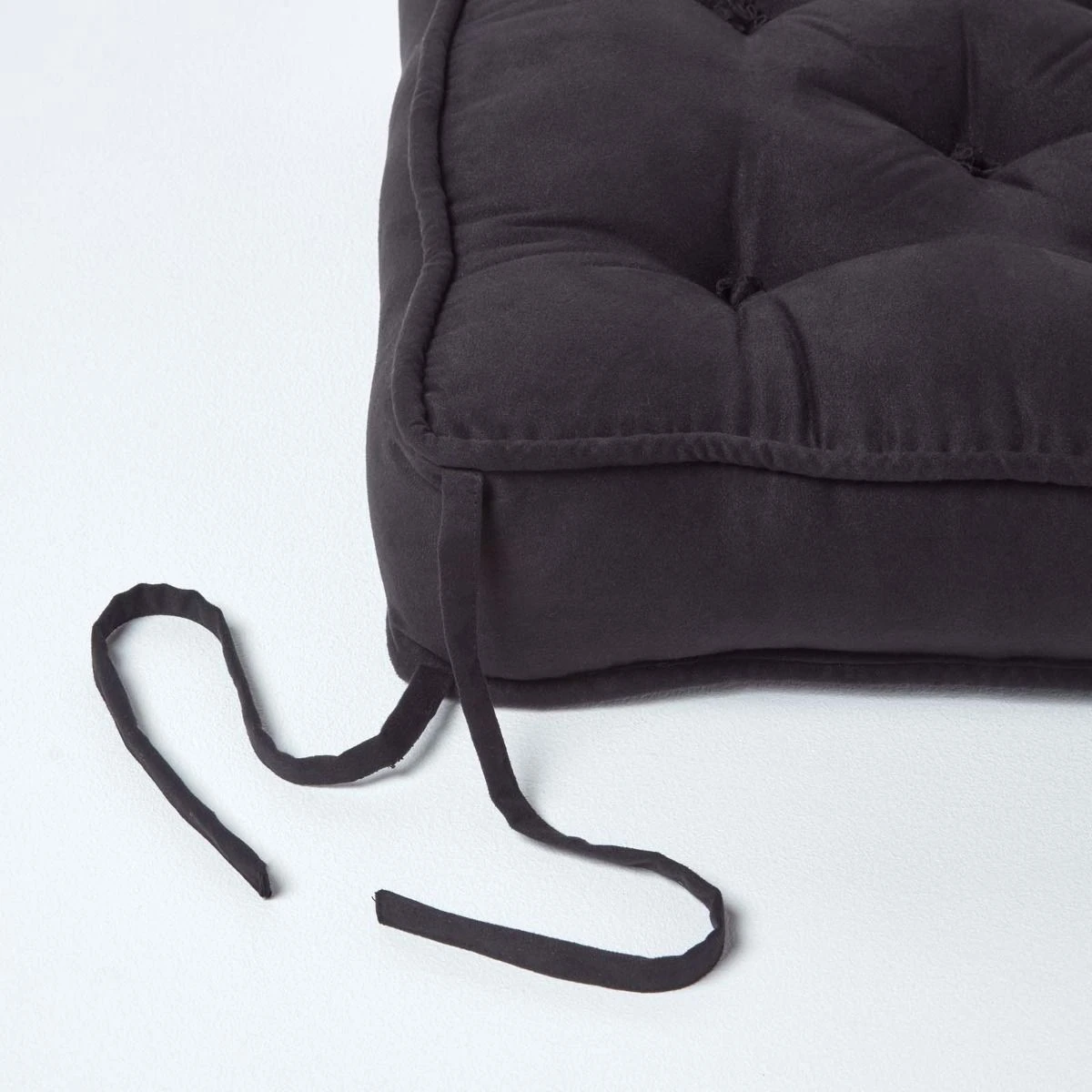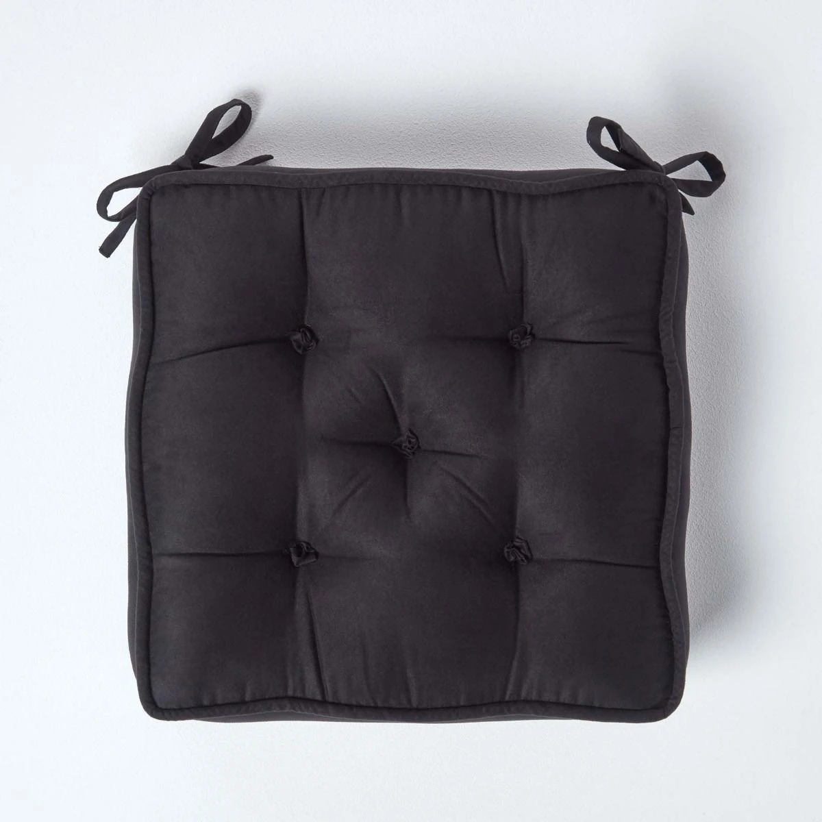 Festes und extra dickes Sitzkissen für Esszimmerstühle mit den Maßen 40 x 40 cm und komfortablen 10 cm Höhe. Das mit praktischen Bindebändern ausgestattete schwarze Kissen hat einen weichen Velours-Bezug und bietet dauerhafte Unterstützung beim Sitzen.
