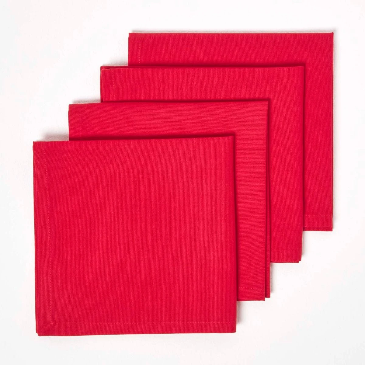 Homescapes Servietten im 4er-Set aus Baumwolle sind in der Waschmaschine bei 40 Grad waschbar. Sie kommen im satten Rot-Ton daher und sind ein toller Blickfang für einen festlich gedeckten Tisch, beispielsweise zu Weihnachten.