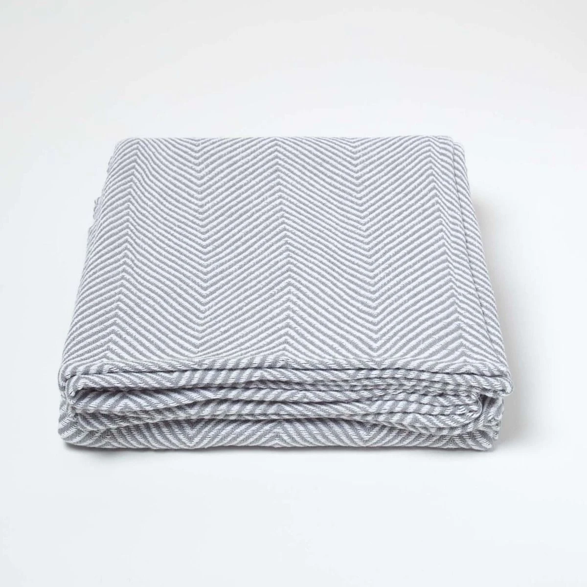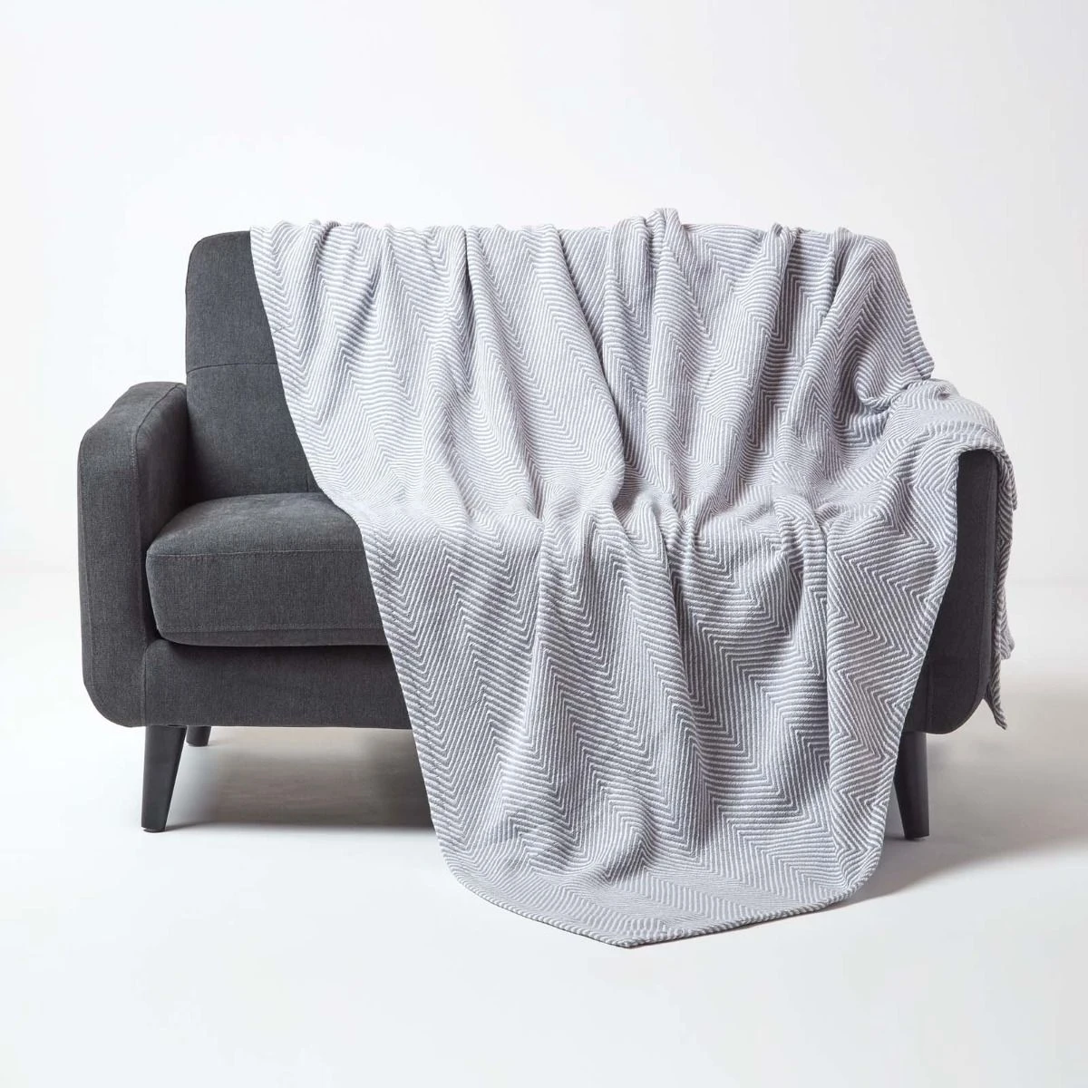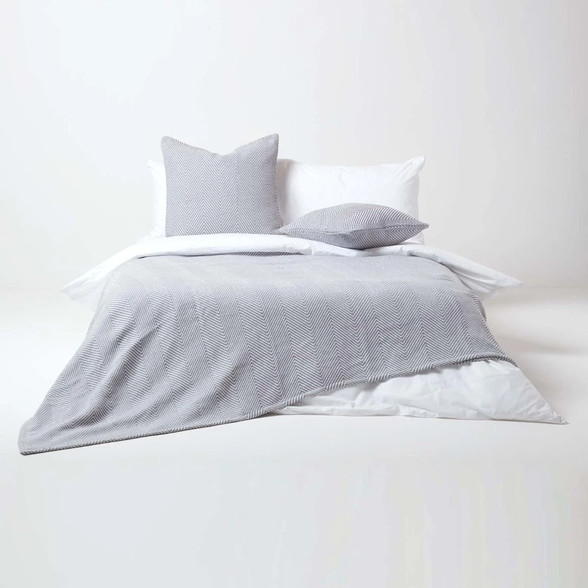 Das moderne und zeitlose Chevrondesign macht den hochwertigen Halden-Überwurf in Grau zum vielseitigen Wohnaccessoire und Blickfang.