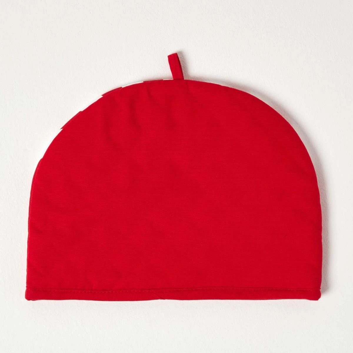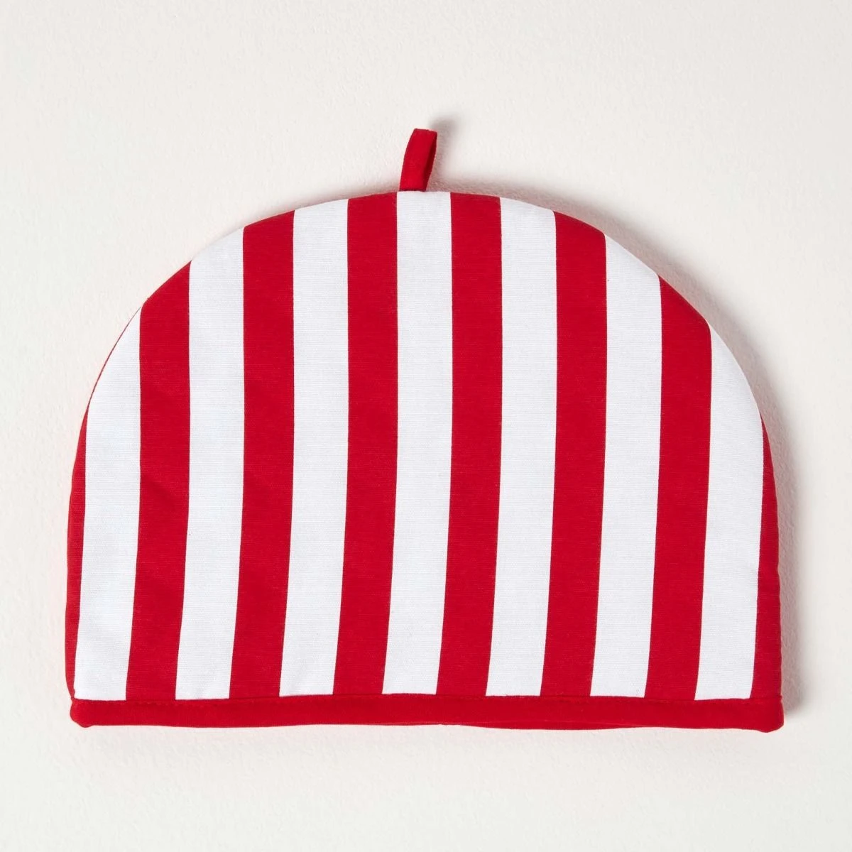 Kannenwärmer breite Streifen rot aus Stoff. Die für England typischen Teekannenwärmer oder auch Tea Cosies, sind ein Muss für jede Teeparty! Homescapes kombiniert Funktionalität mit farbenfrohen Designs und bietet Ihnen insgesamt 15 einzigartige Stoffmuster. Die Teewärmer werden aus 100% Baumwolle hergestellt und mit Polyester gefüllt. Diese niedlichen Wärmer verleiht Ihrer Teekanne oder Kaffeekann zu vielen Anlässen das gewisse Etwas. Sei es für Ihr gemütliches Familienfrühstück am Sonntag, dem Kaffeeklatsch mit Freundinnen oder dem gemütlichen Abend mit einer Tasse Tee an einem kalten Wintertag. Diese originellen Stoff Kannenwärmer halten Ihr Lieblingsgetränk zuverlässig warm. Dank der praktischen Schlaufe könenn Sie den Teekannen Wärmer ganz einfach von der Kanne nehmen und aufhängen.