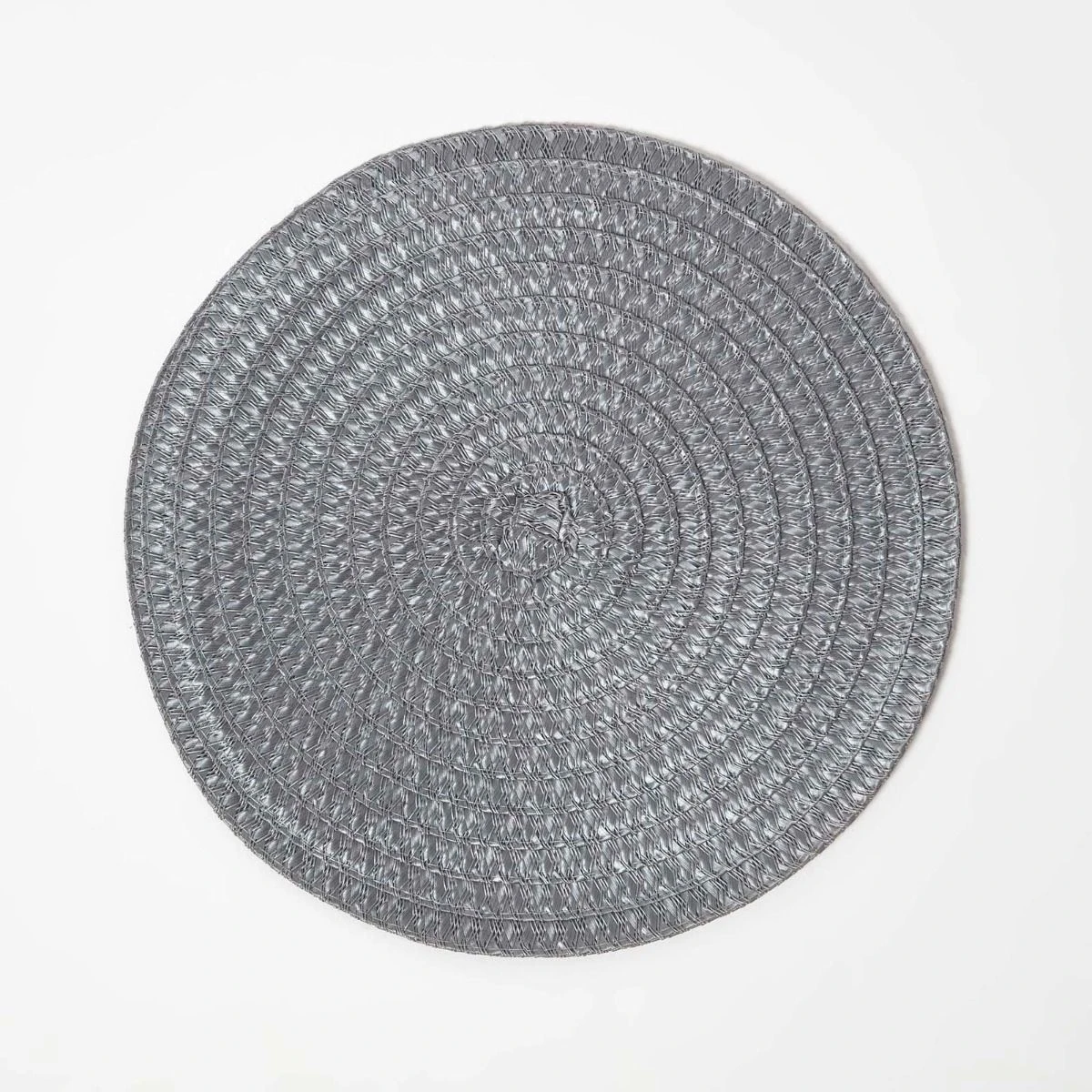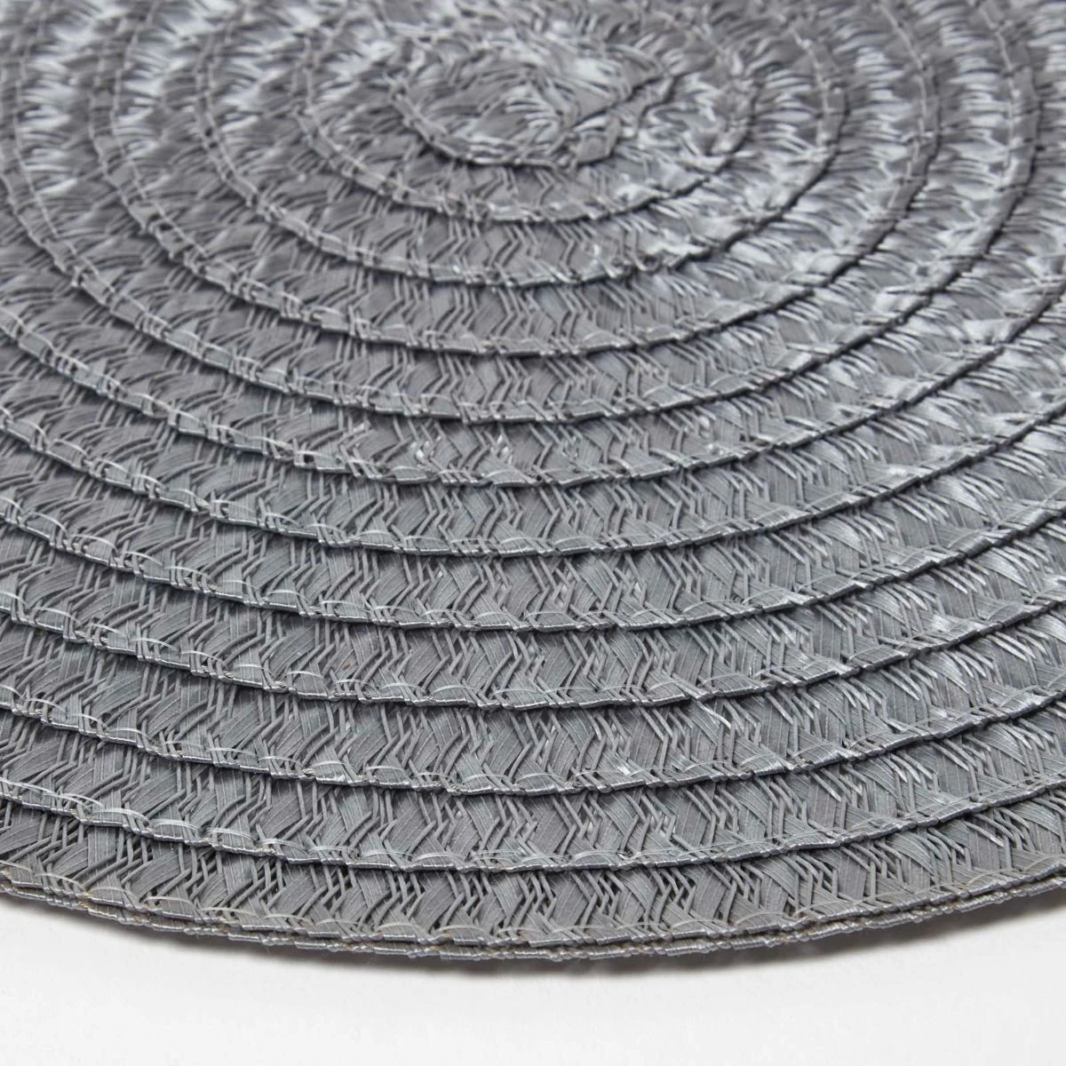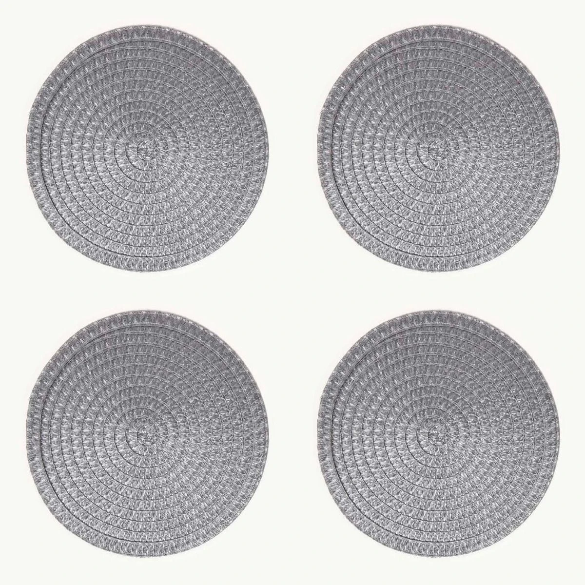 4er-Set stilvolle geflochtene graue Platzsets. Die abwaschbaren Tischsets haben einen Durchmesser von 36 cm und sind eine attraktive und praktische Ergänzung für jeden Esstisch.