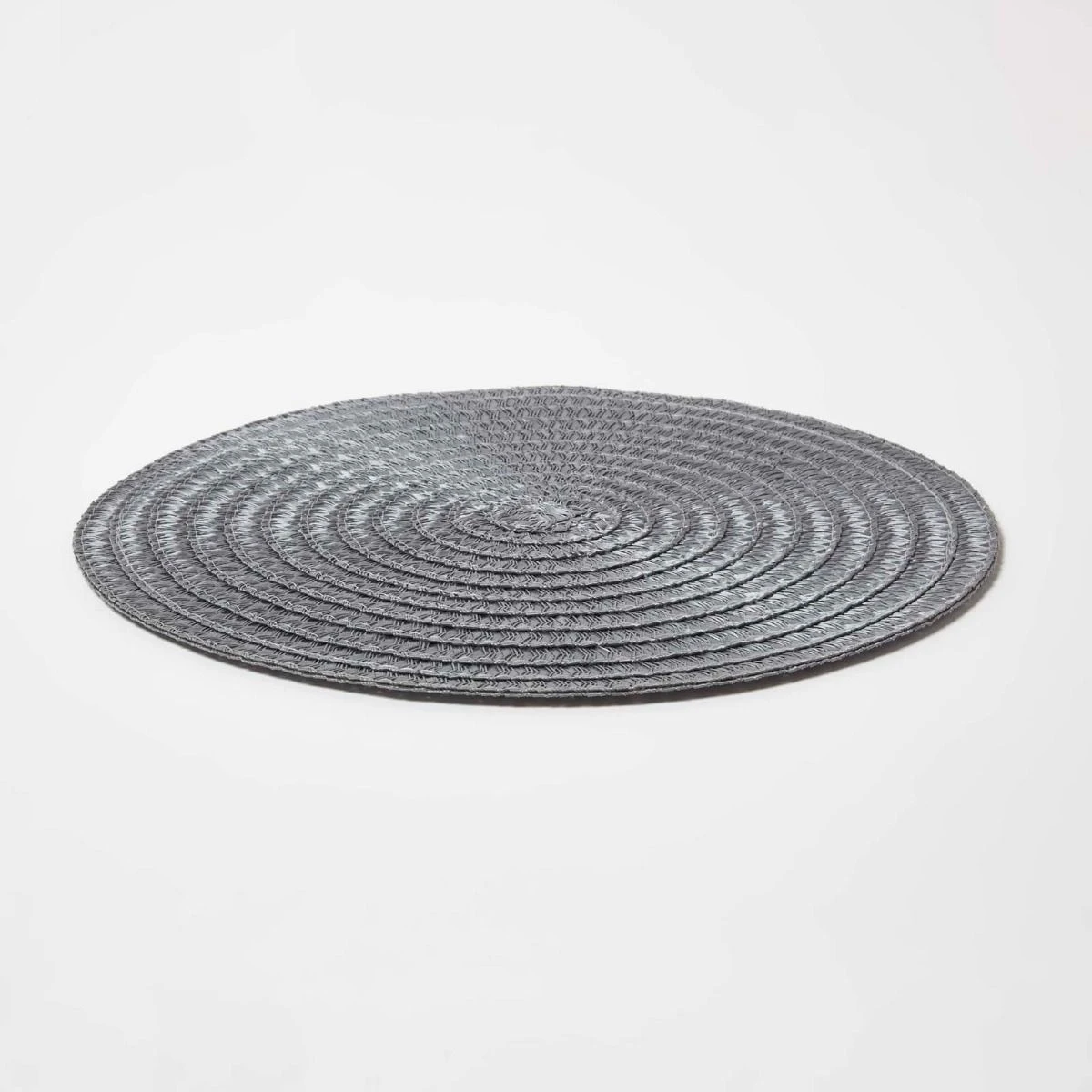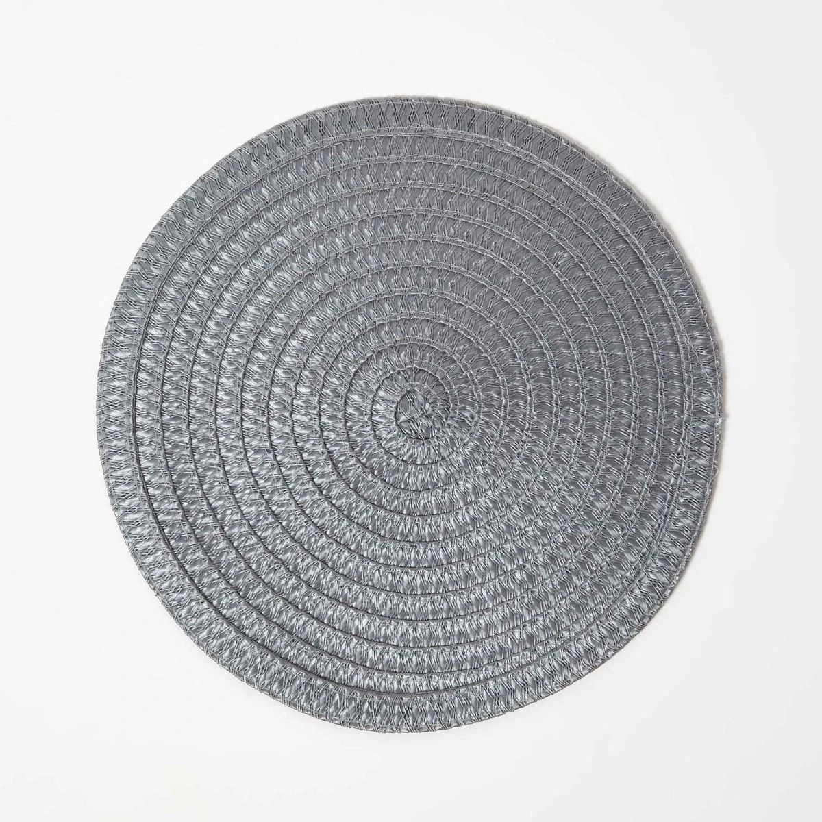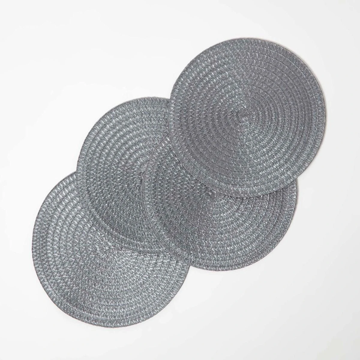 4er-Set stilvolle geflochtene graue Platzsets. Die abwaschbaren Tischsets haben einen Durchmesser von 36 cm und sind eine attraktive und praktische Ergänzung für jeden Esstisch.