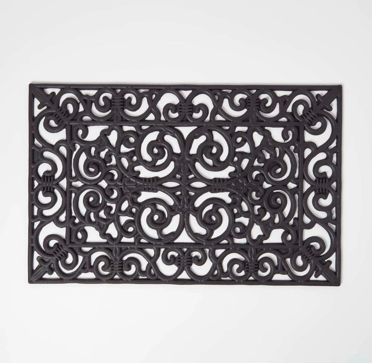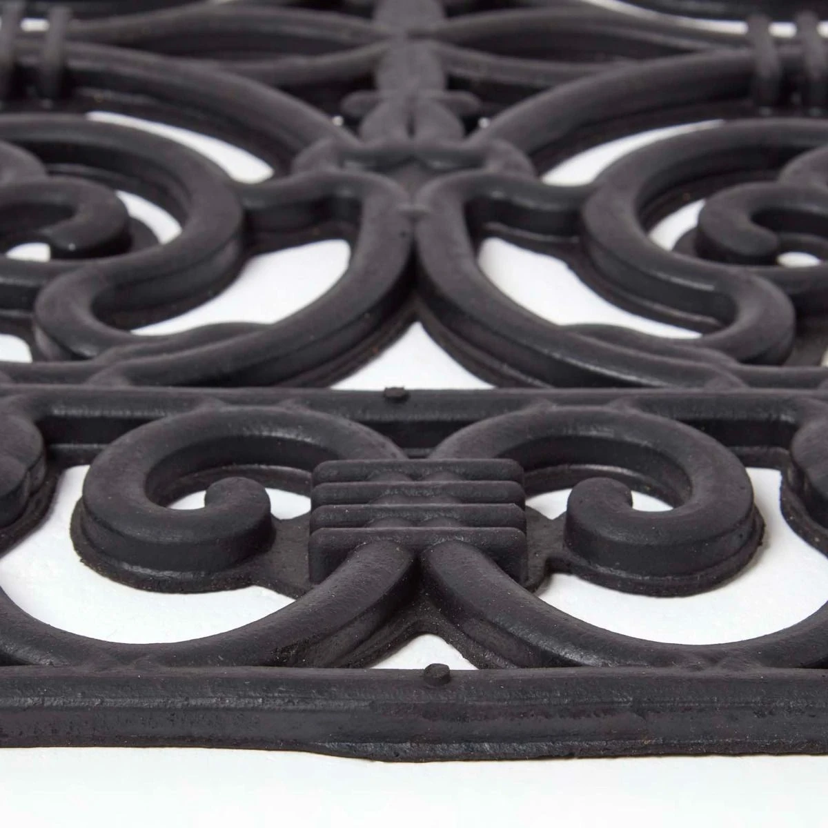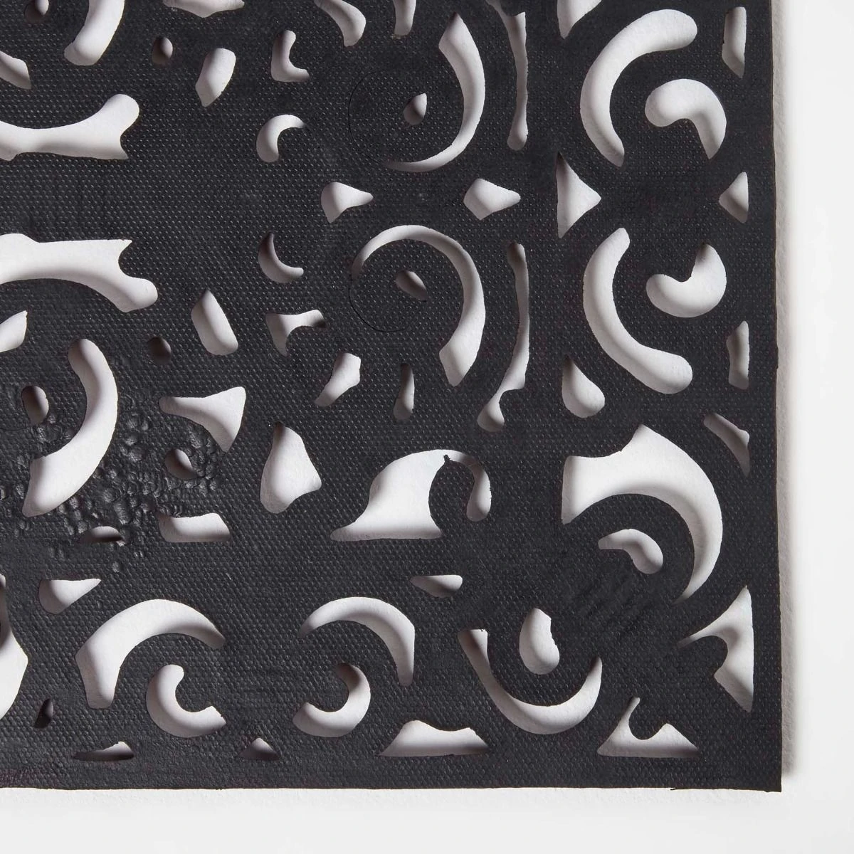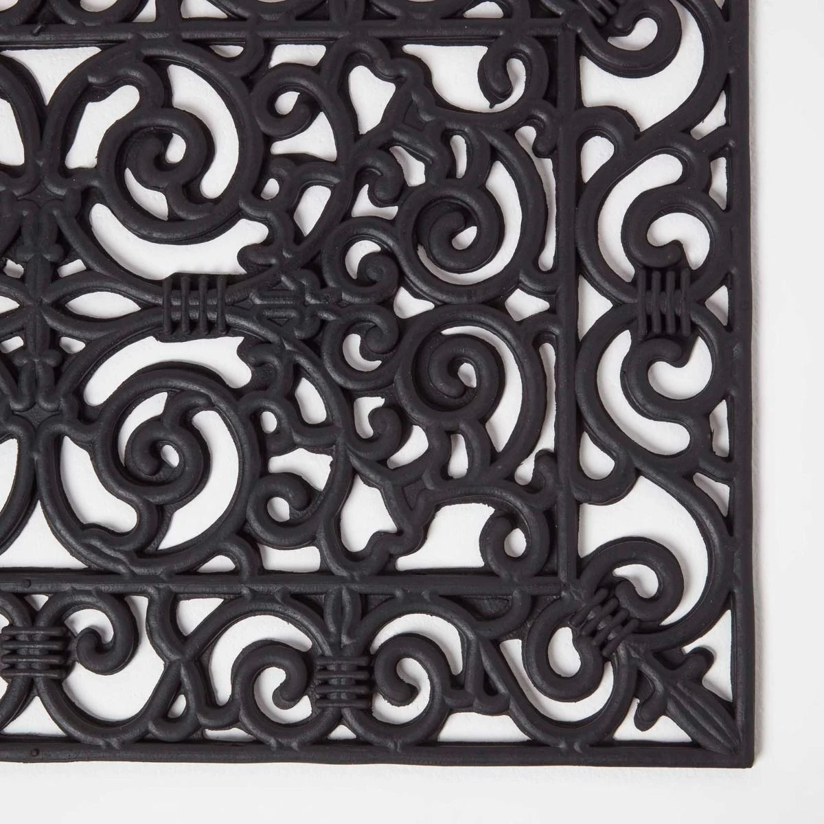 Homescapes schwarze Fußmatte mit viktorianischem Muster besteht aus 100% rutschfestem Gummi. Ideal für den Haustür-Bereich als schöne und praktische Deko zugleich.