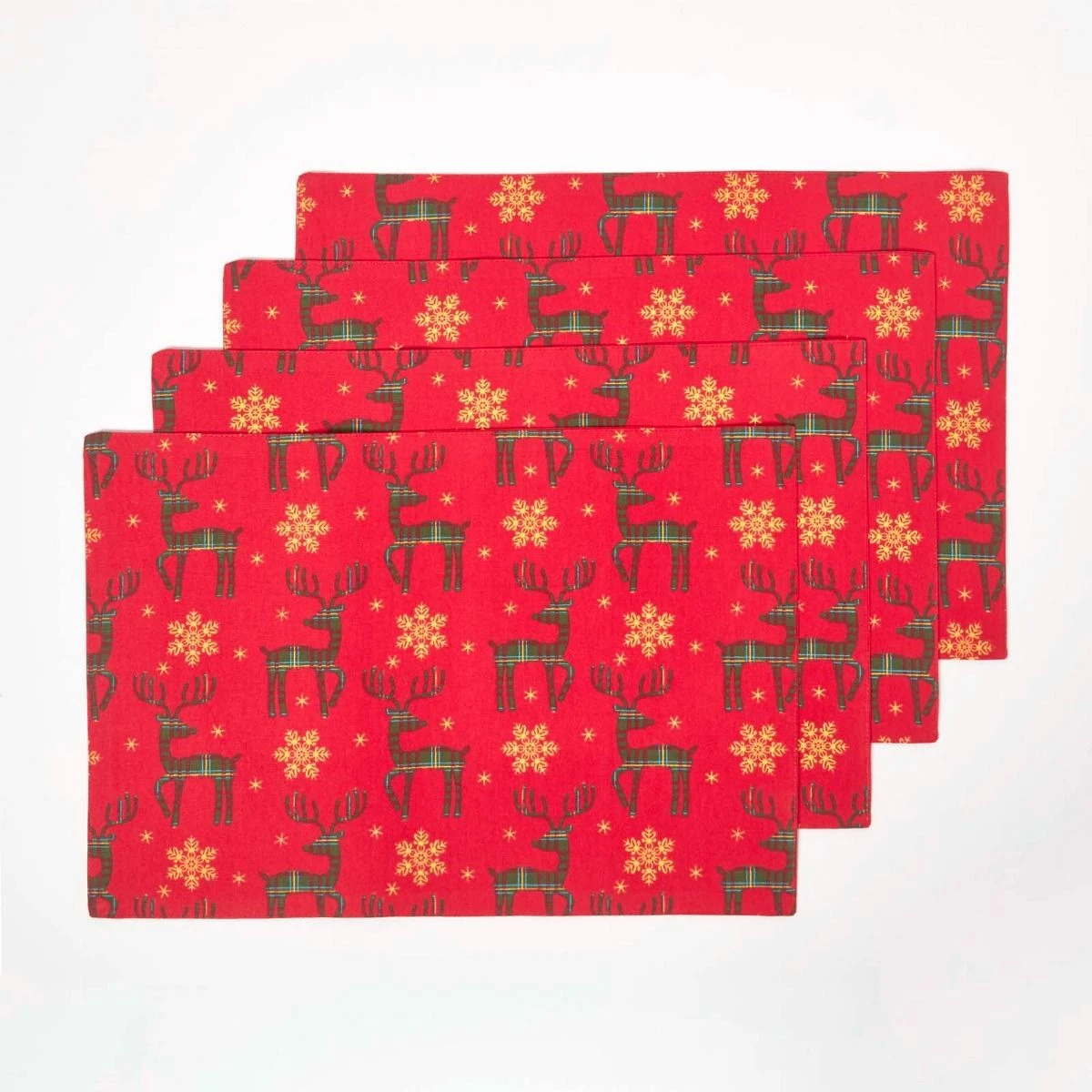 Die perfekte weihnachtliche Farbkombination: Die Platzdeckchen im traditionellen Stil zeigen Rentiere in grünem Schottenkaro, umgeben von goldenen Schneeflocken vor einem weihnachtlichen roten Hintergrund. Sie sind Teil der exklusiven roten Rentier Kollektion von Homescapes, zu der auch passende Servietten, Tischdecken und Küchenaccessoires erhältlich sind. Die Tischsets können bei 40 Grad in der Maschine gewaschen und auf der Rückseite gebügelt werden.