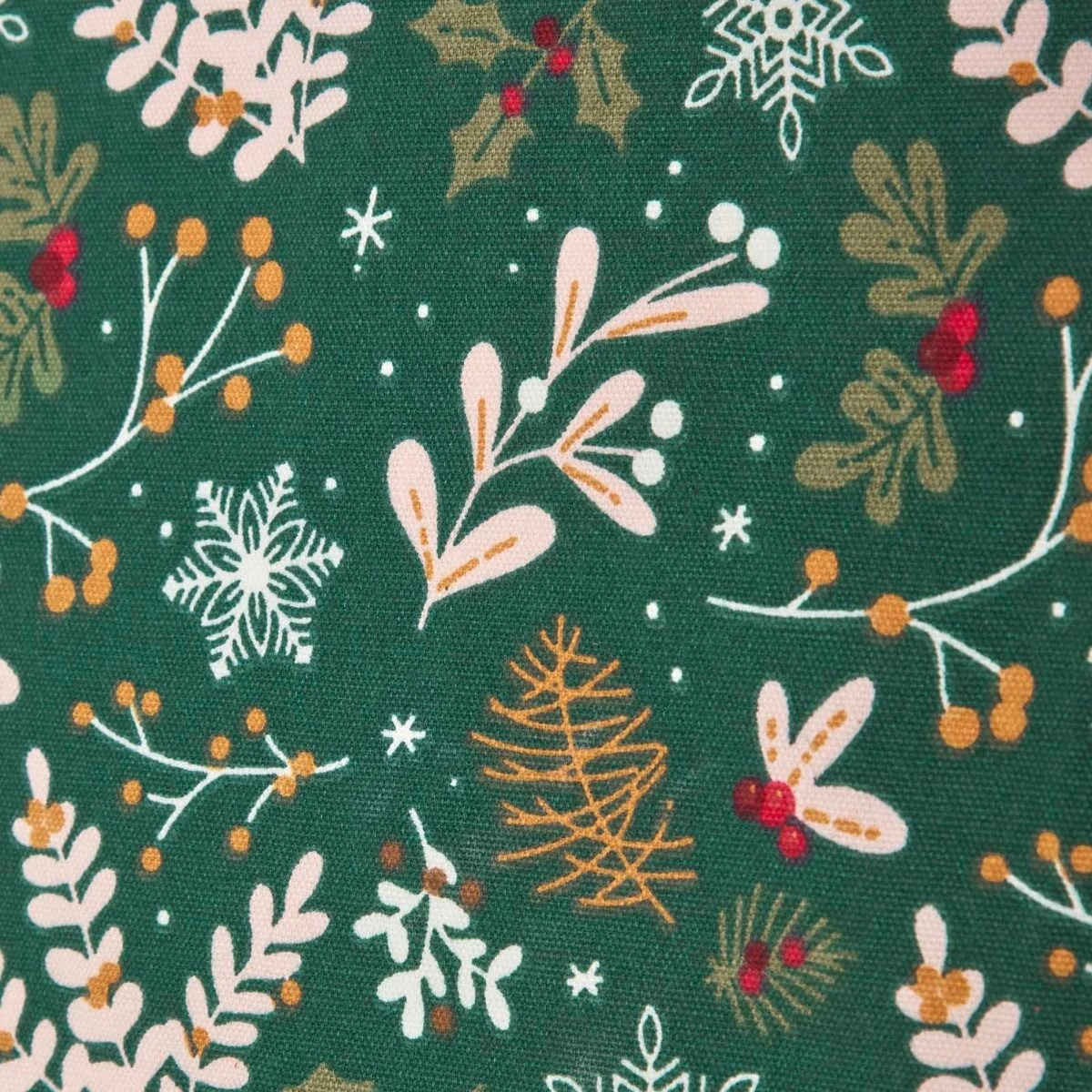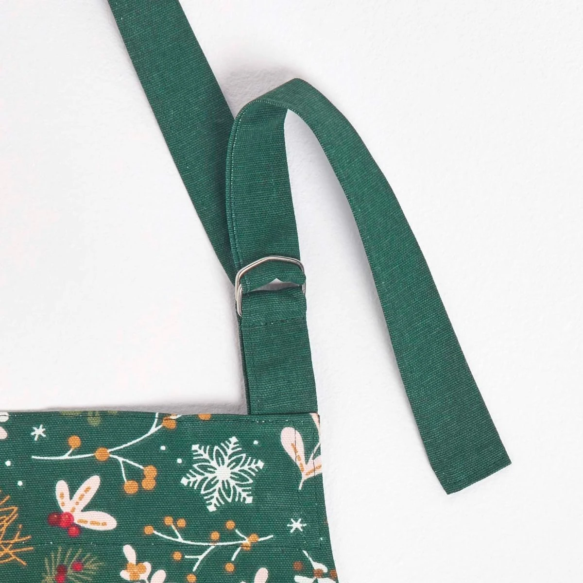 Farbenfrohe und festliche Küchenschürze aus 100% Baumwolle. Die grüne Schürze zeigt ein lebhaftes florales Weihnachtsmuster, hat einen verstellbaren Riemen und eine große Fronttasche.